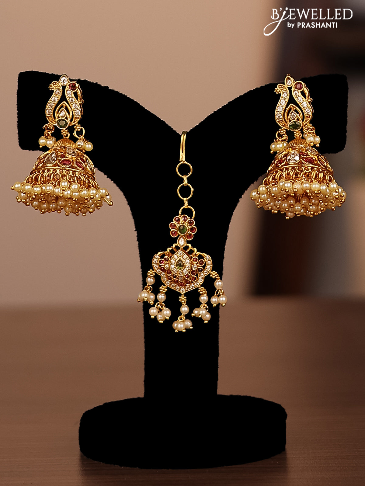 Antique guttapusalu combo set manga pattern with jadau kundan stones and pearl hangings