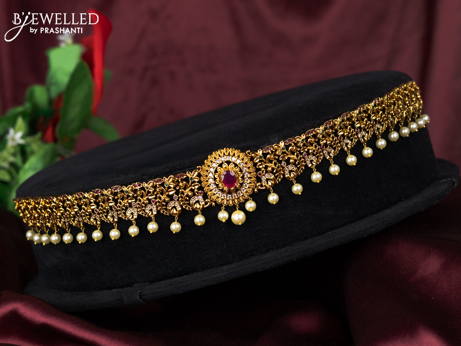 Antique hip belt floral design with kemp & cz stones and pearl hangings