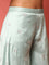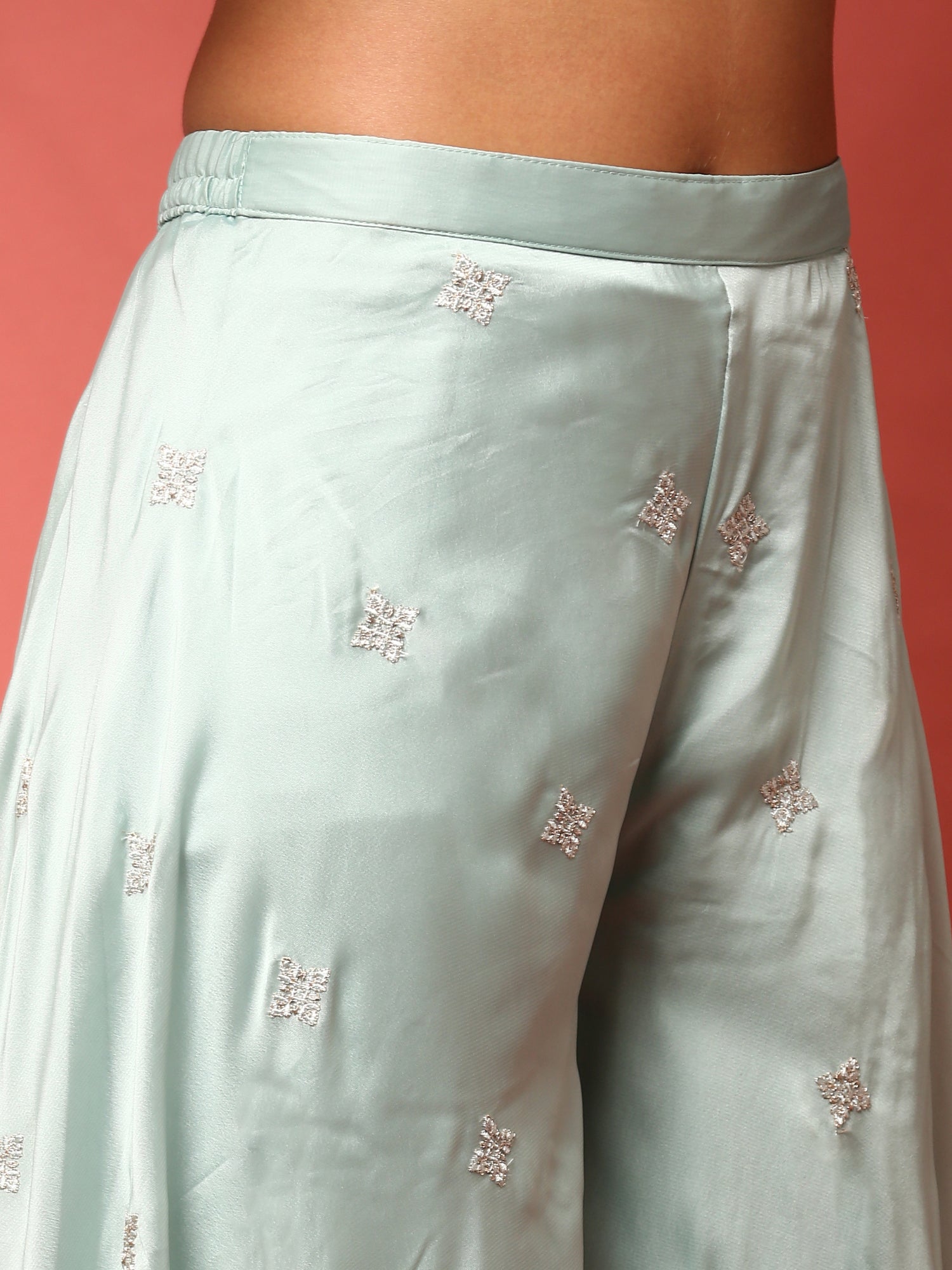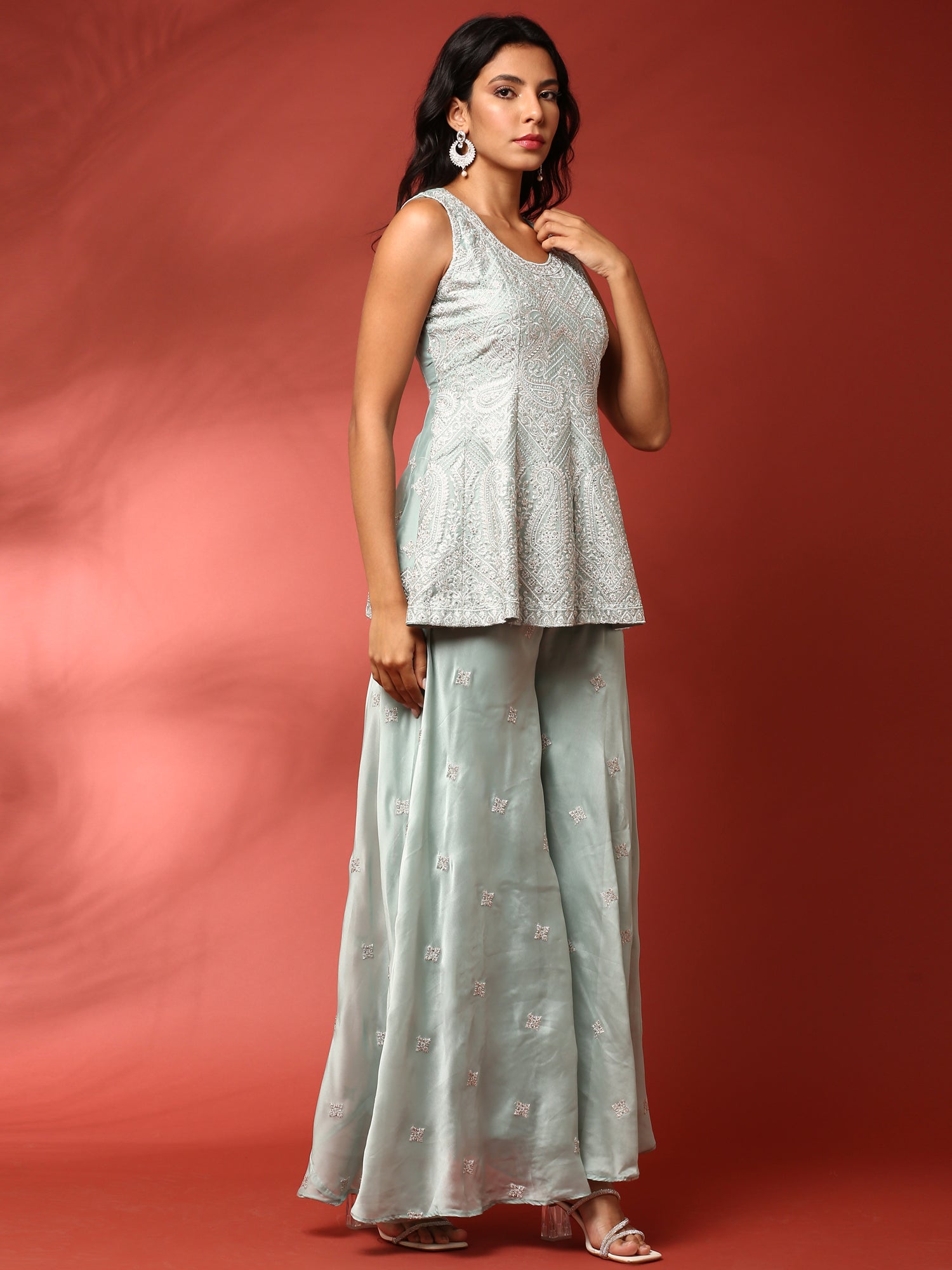 Elevate your wardrobe with this aqua green three-piece palazzo set, featuring intricate hand embroidery that showcases exquisite craftsmanship. The flowing palazzo pants offer comfort and elegance, perfectly complemented by a matching embroidered top and coordinating dupatta. Ideal for festive occasions or sophisticated gatherings, this set combines traditional artistry with contemporary style for a refined, graceful look.