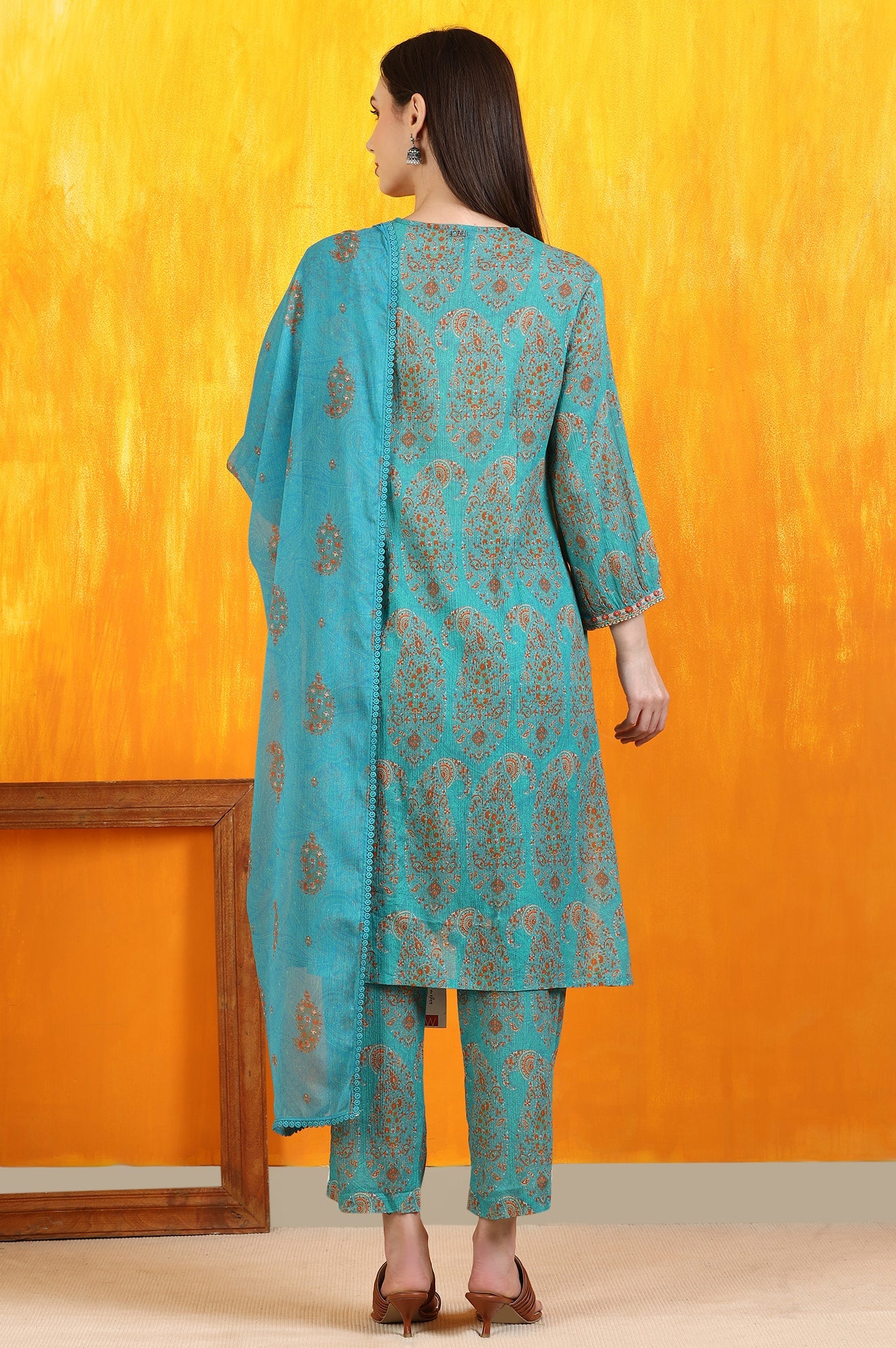 Aqua Green Paisley Printed Cotton Crepe Straight Kurta and Pants Set with Dupatta