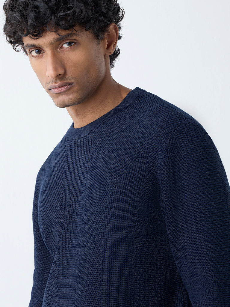 Ascot Navy Knit-Textured Relaxed-Fit Cotton Sweater