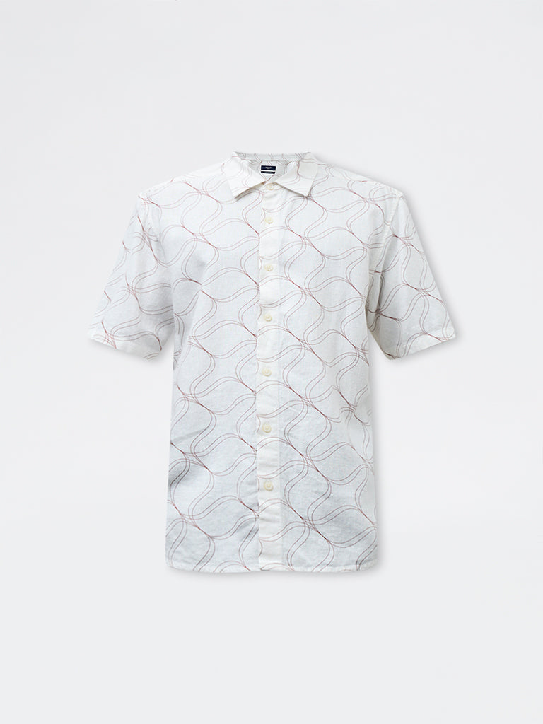 Ascot introduces this off-white shirt detailed with abstract prints that lend a refined touch. Cut in a relaxed fit, it is crafted from a soft, lightweight fabric that ensures breathable comfort. Finished with a classic collar, buttoned placket and short sleeves, it balances easy wear with a neat, structured look.