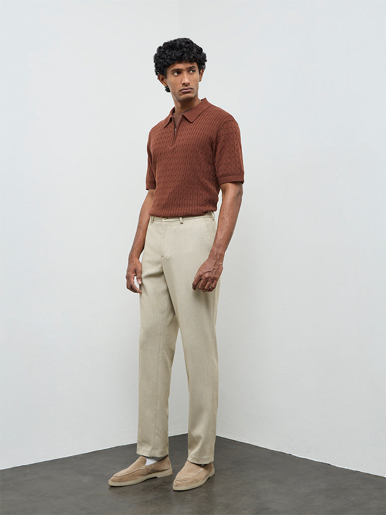 A simple pick for everyday polish, this rust polo t-shirt from Ascot is crafted from a cable-knit cotton fabric, delivering sumptuous comfort. Carved in a relaxed frame, it carries a classic collar, a short zipper placket and short sleeves. This minimal silhouette is designed for easy styling across casual and off-duty looks.