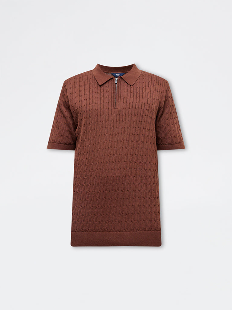 Ascot Rust Cable-Knit Relaxed-Fit Quarter-Zip Cotton Polo T-Shirt
