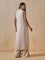 This cream top captures the essence of festive elegance with ease. Designed sleeveless with a collared neckline, it flows into an asymmetric hem that adds a graceful edge. The metallic buttons glimmer like subtle embellishments, making it an effortless choice for daytime celebrations and evening soirées alike.