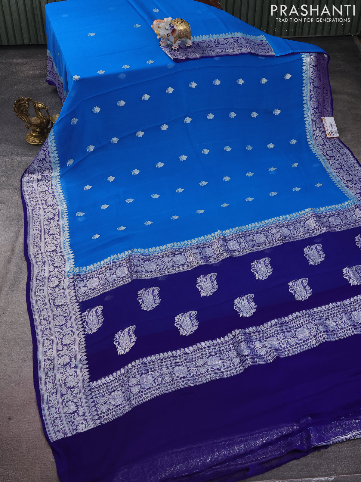 Banarasi chiffon silk saree cs blue and blue with silver zari woven buttas and silver zari woven border