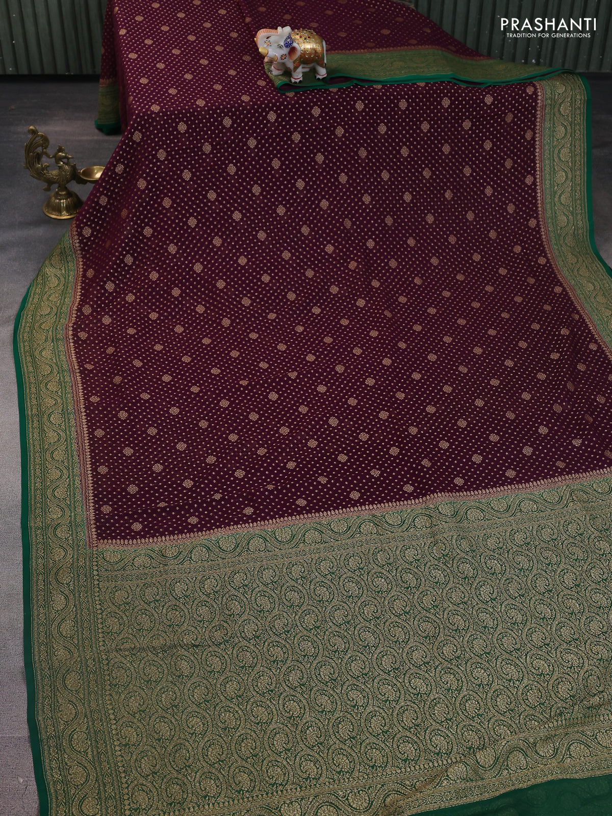 Banarasi georgette saree wine shade and green with allover woven buttas and woven border