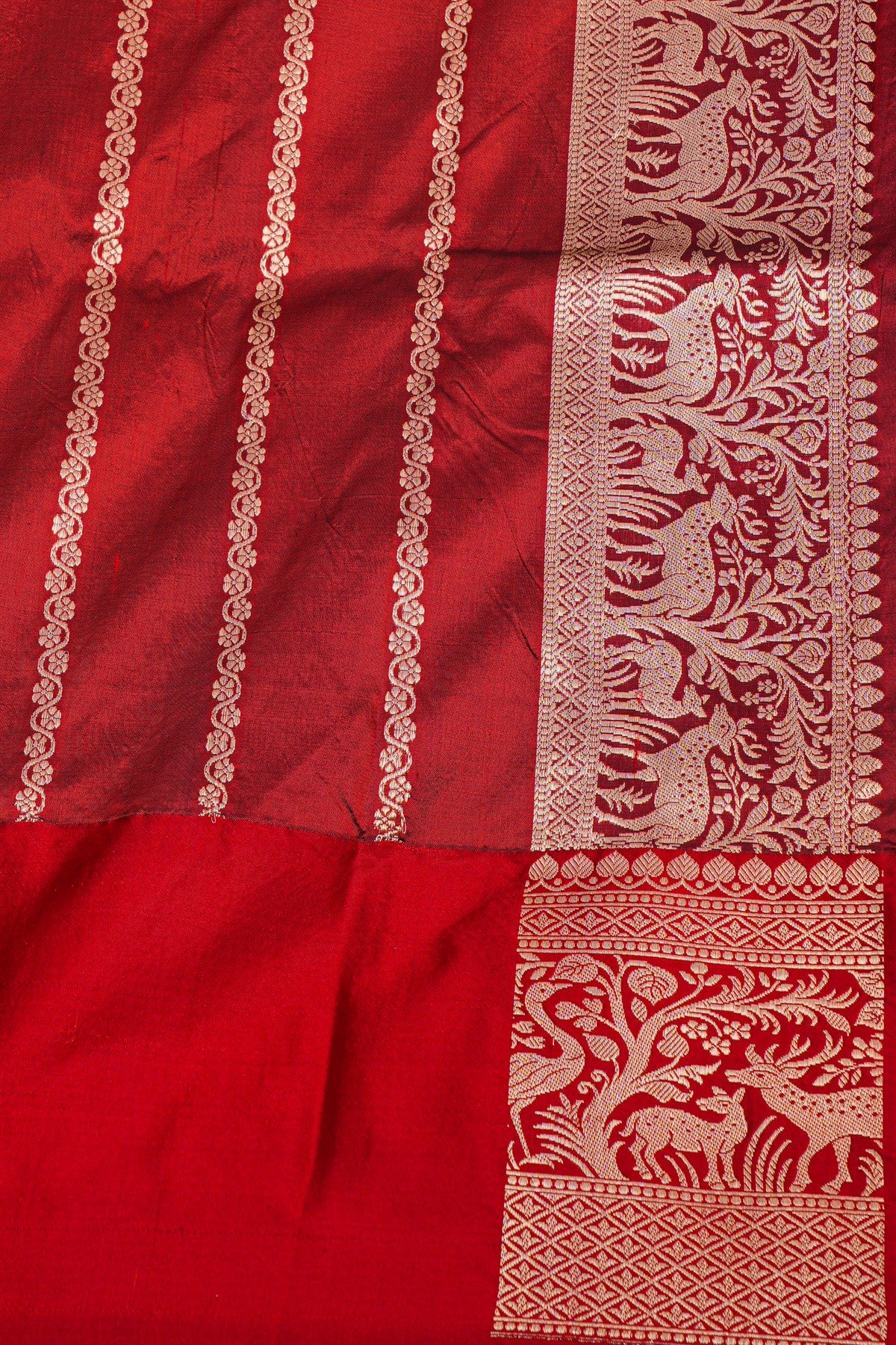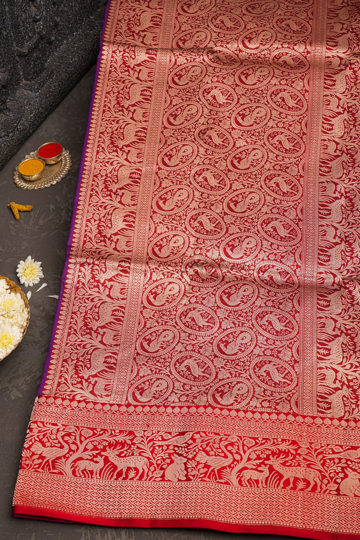 Embrace your spiritual self in this Banarasi Kathan Silk Purple Saree. This goddess inspired saree is tastefully adorned with florals and deers. The contrast border decorated with florals and animals resonates with the essence of culture. The grand brocade pallu and the regal contrast with border blouse puts together an eclectic ensemble.
