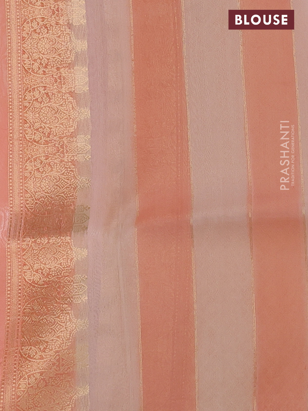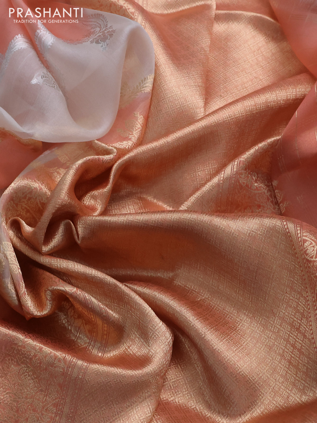 Banarasi organza silk saree off white and peach orange with rangakt weaves and zari woven piping boder