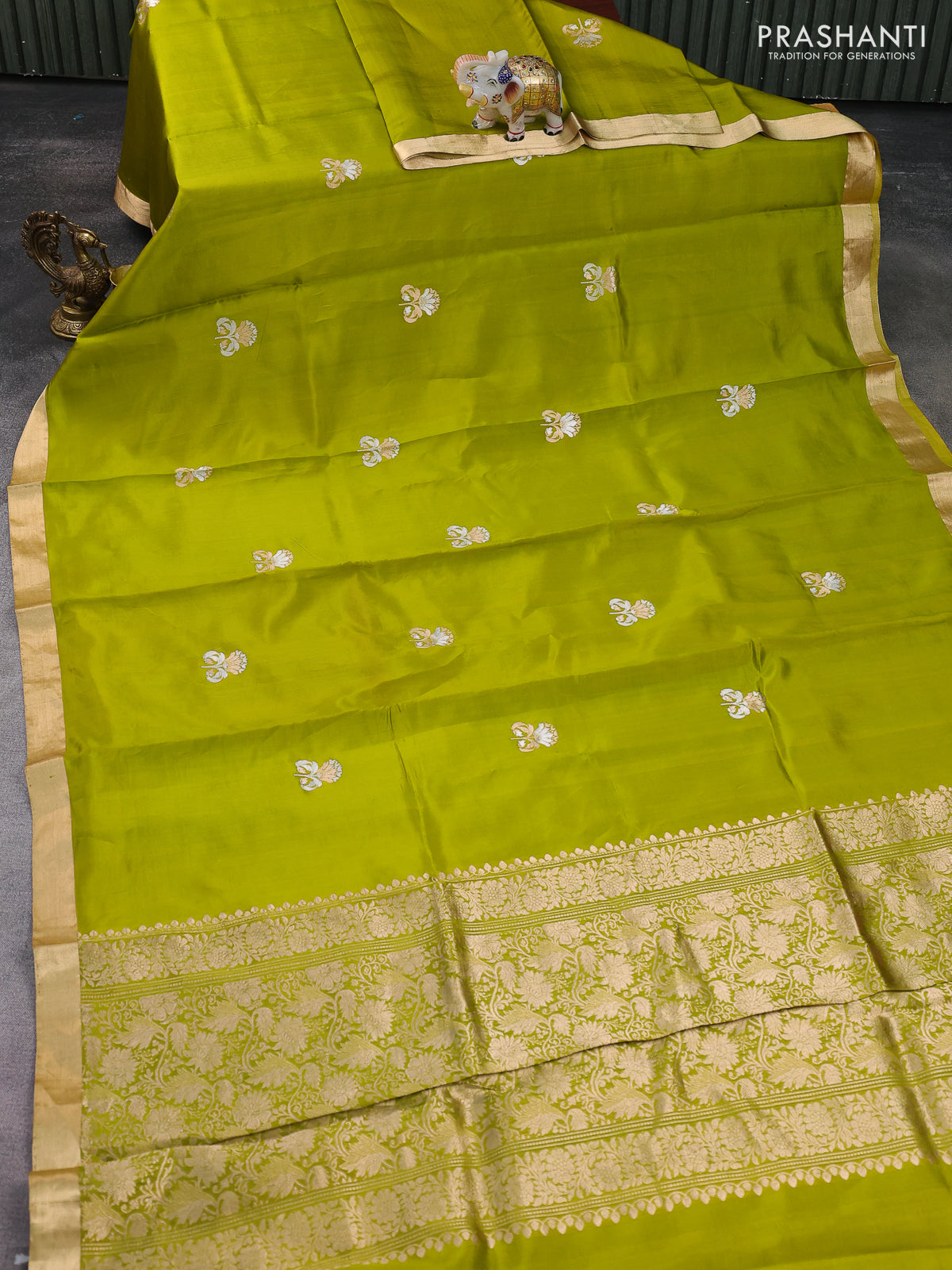 Banarasi poona silk saree lime green with zari woven floral buttas and zari woven border