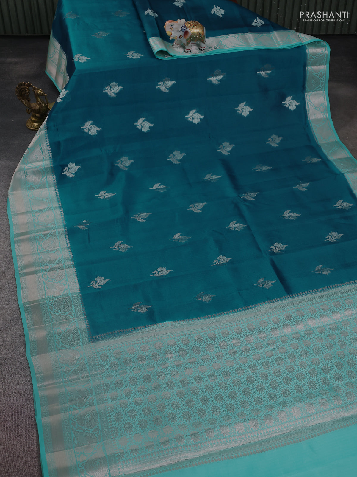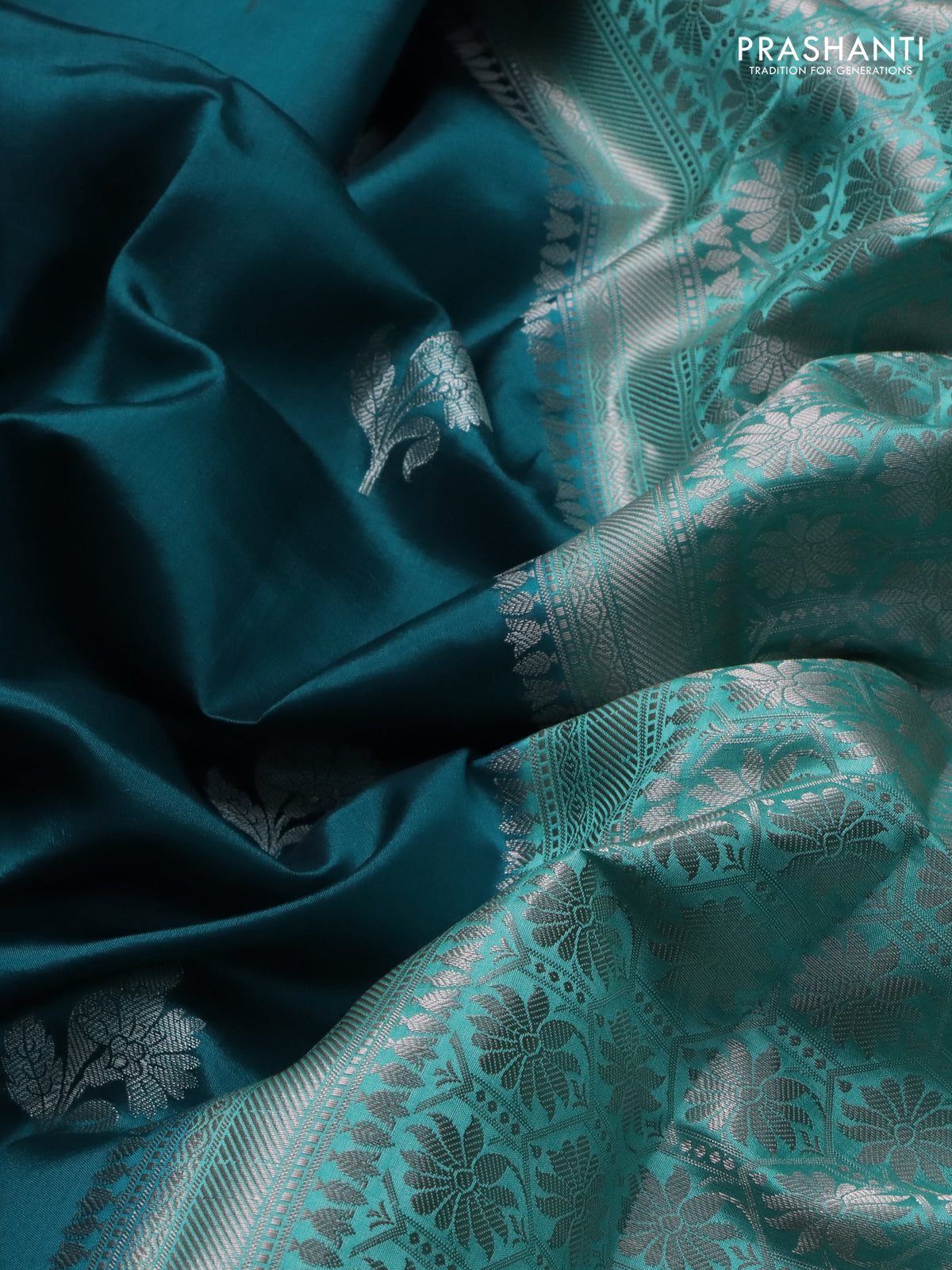 Banarasi poona silk saree peacock blue and teal green shade with zari woven floral buttas and long zari woven border
