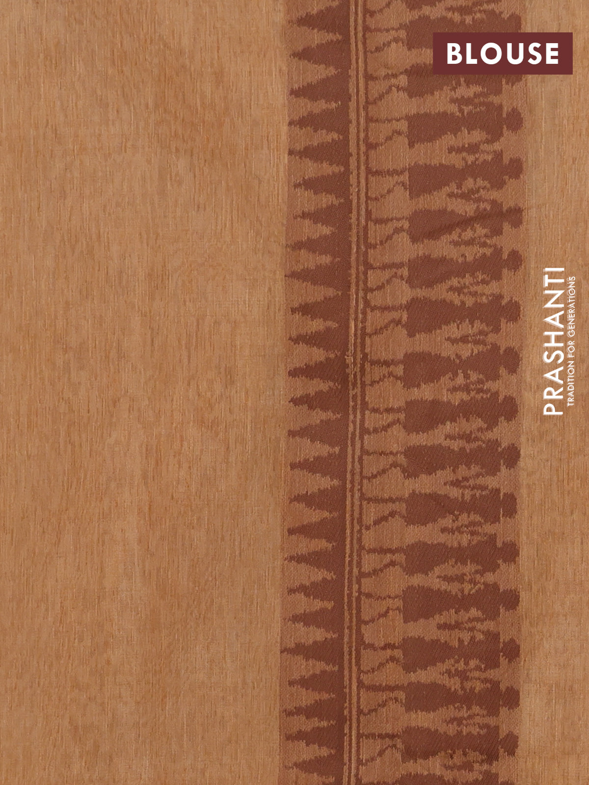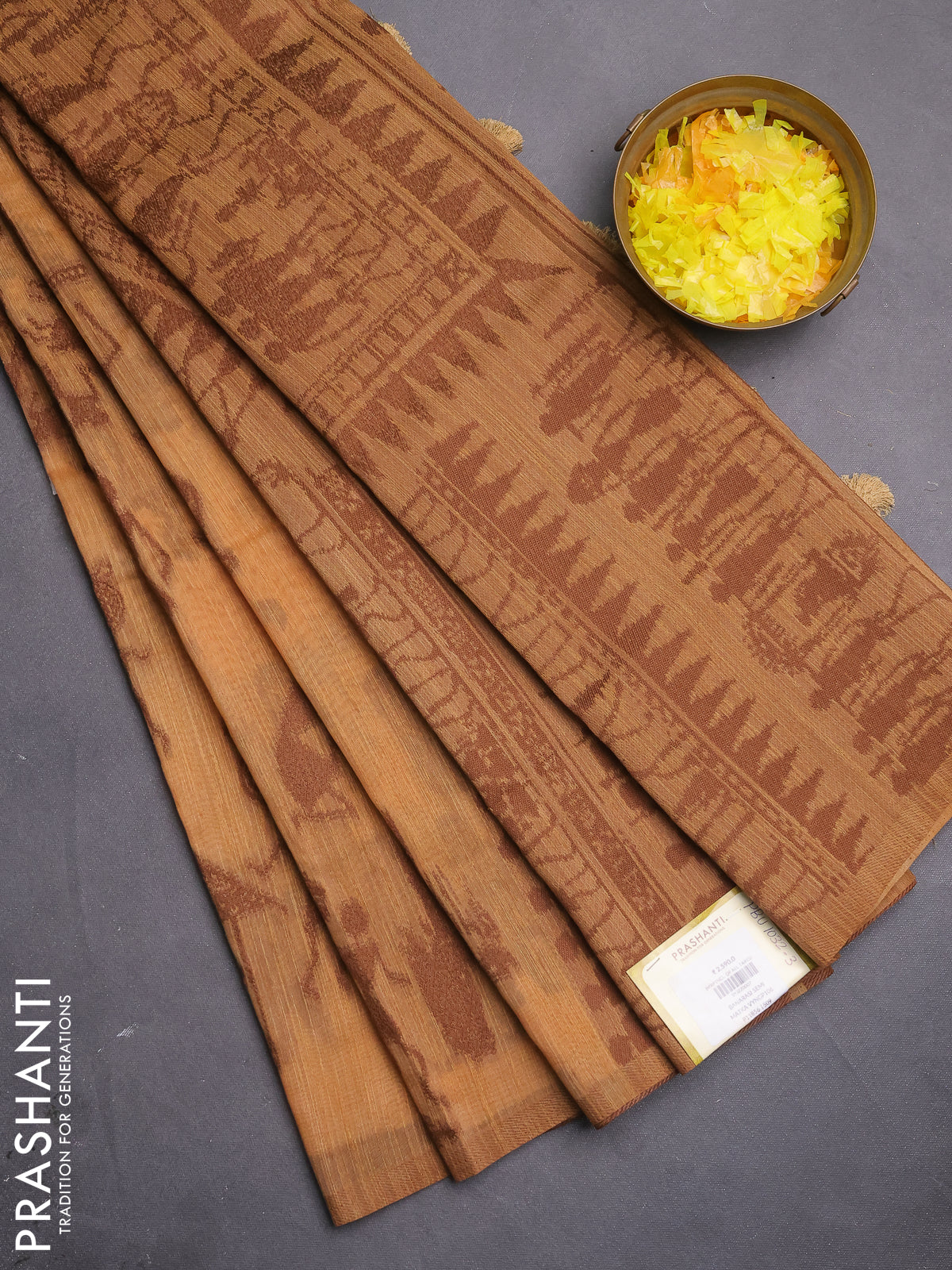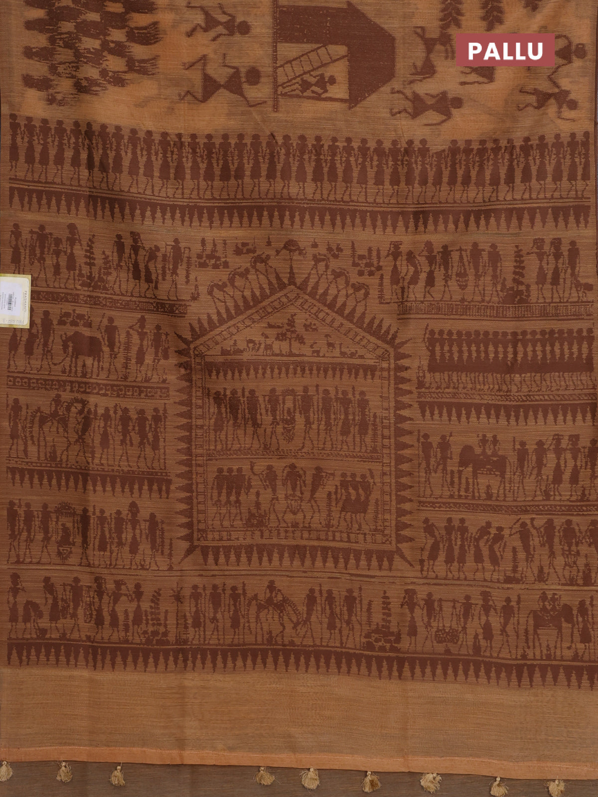 Banarasi semi matka saree dark sandal with allover warli design thread weaves in borderless style