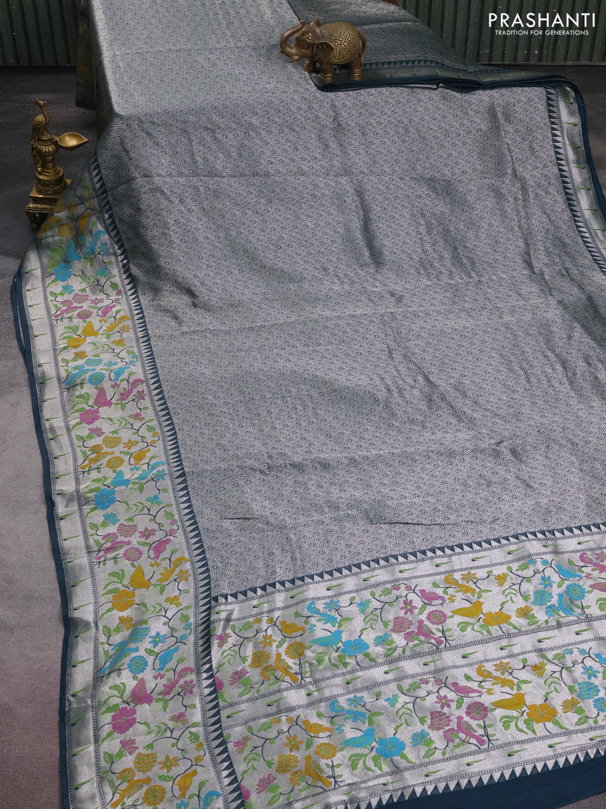 Banarasi semi raw silk saree peacock blue with allover silver woven brocade weaves and floral design paithani border