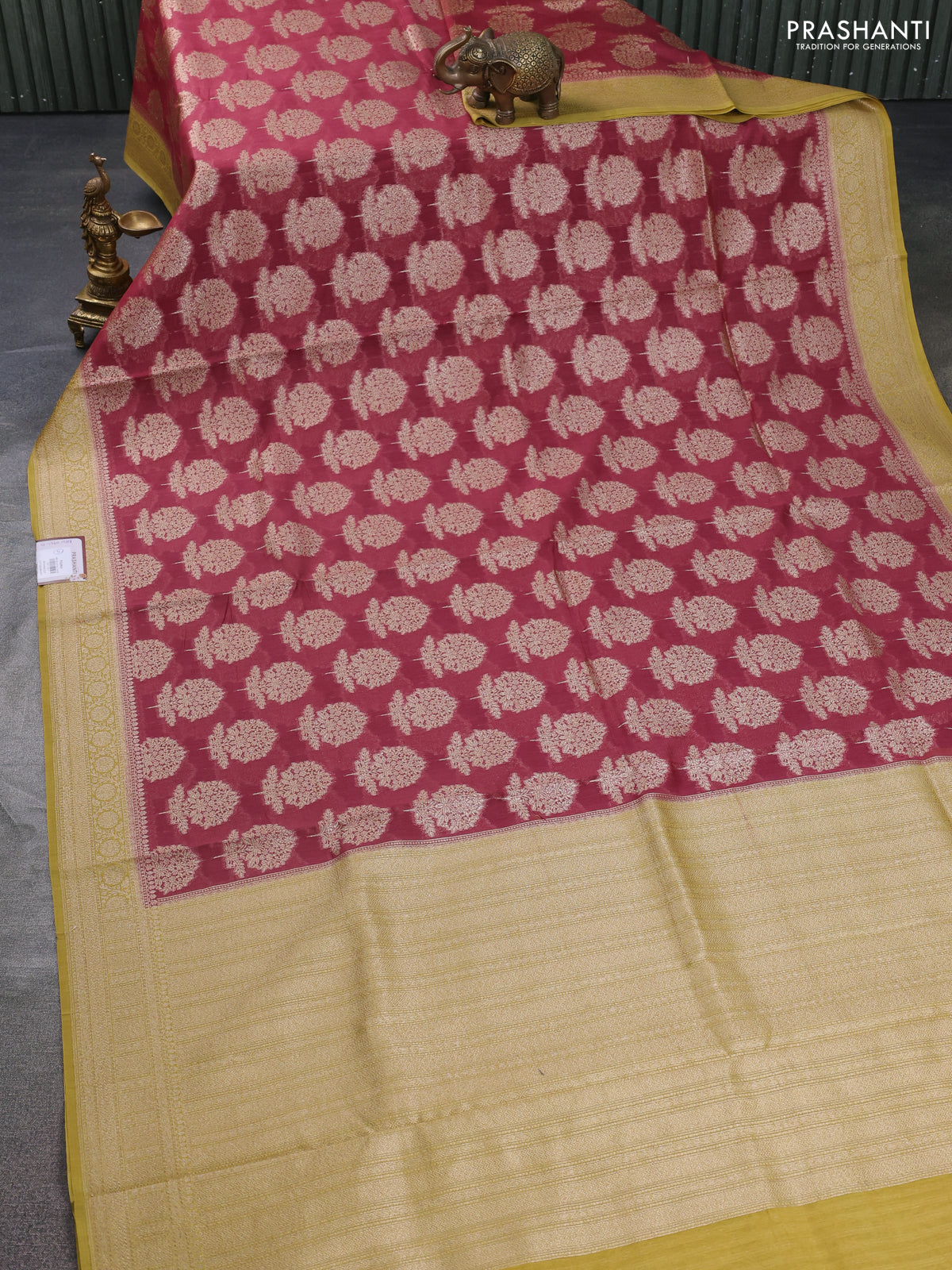 Banarasi silk cotton saree pastel maroon and yellow shade with allover thread & zari woven butta weaves and woven border