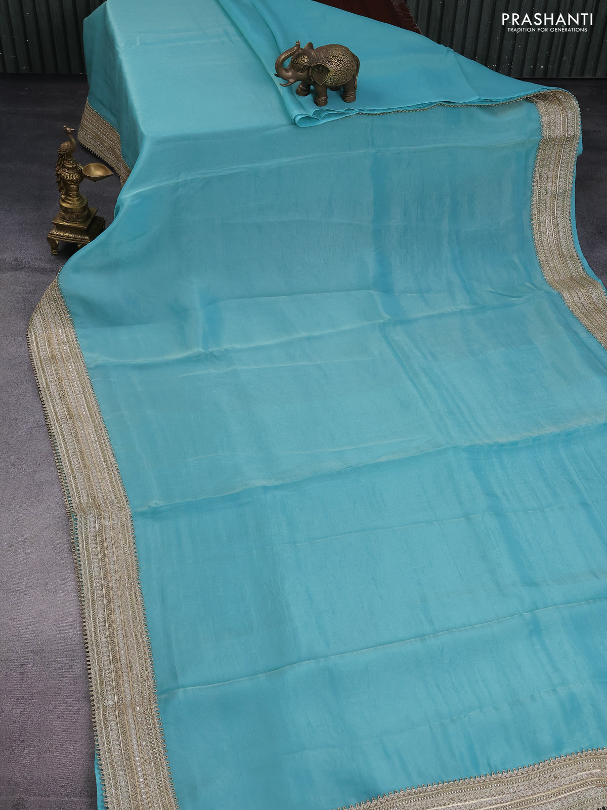 Banarasi tissue saree teal blue with plain body and lace work border