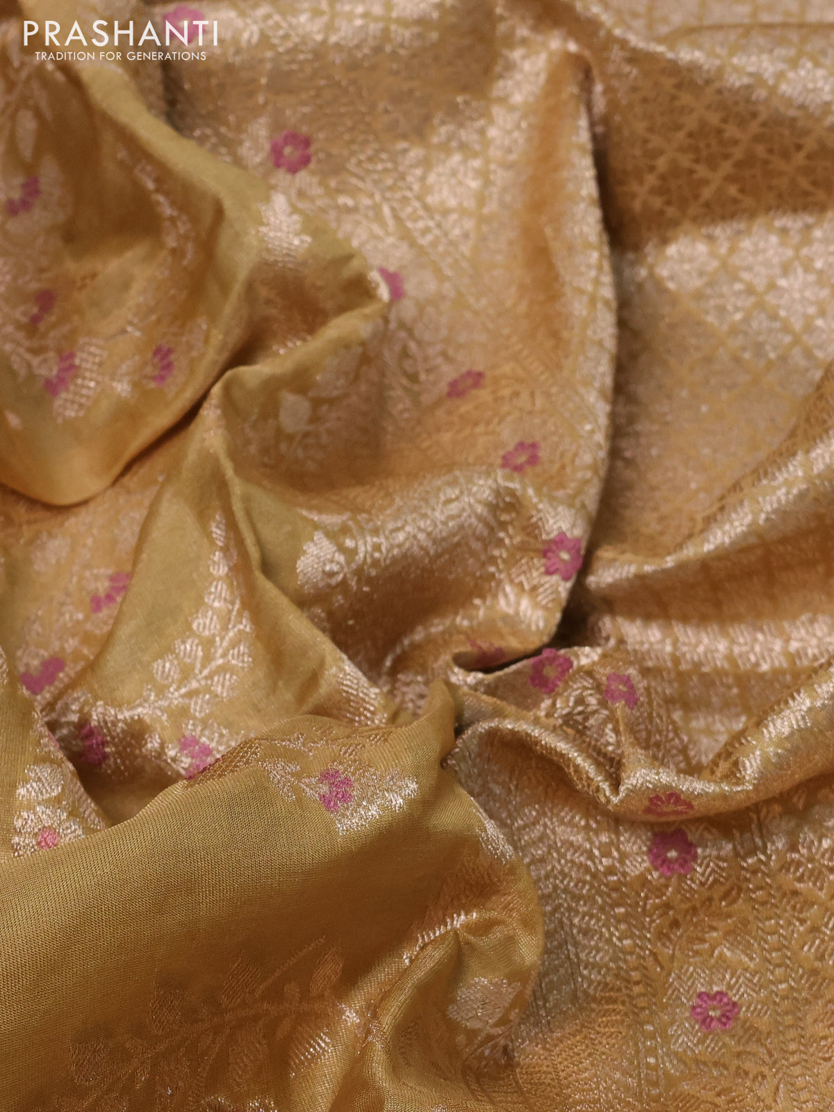 Banarasi tissue silk saree sandal with allover floral zari woven brocade weaves and zari woven border