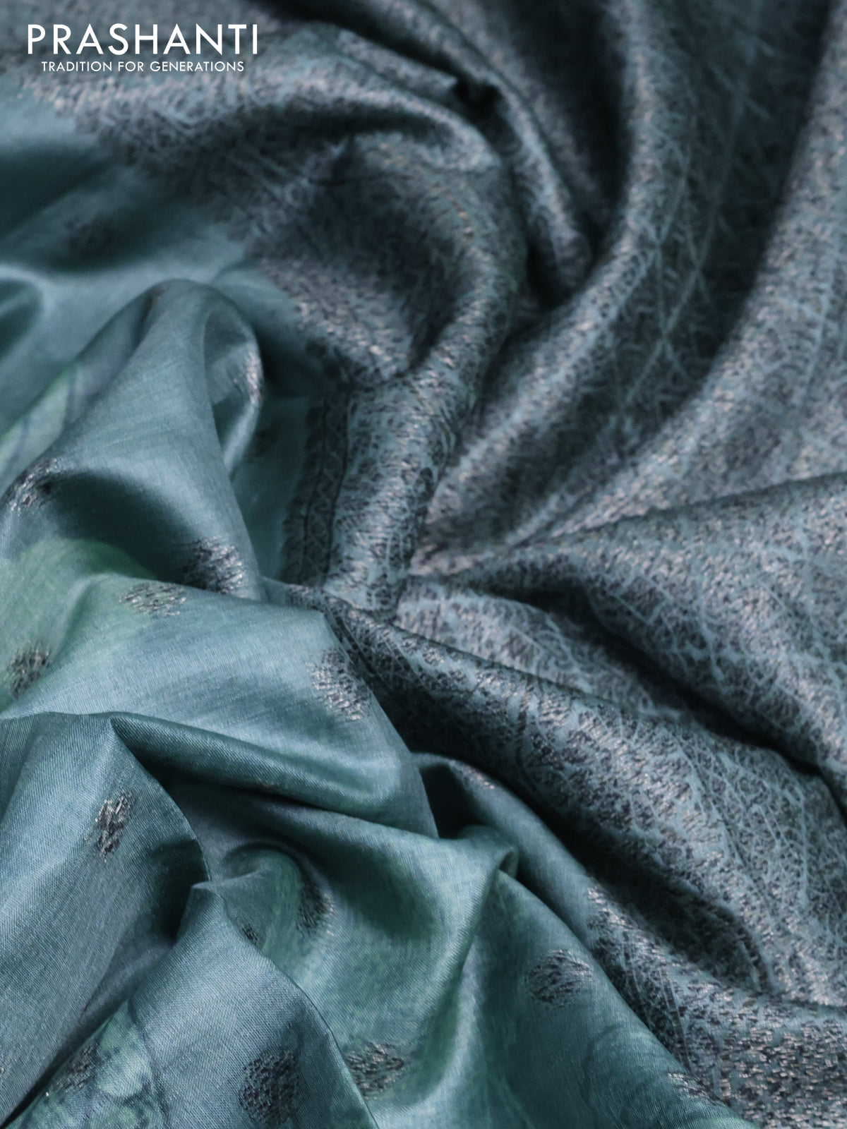 Banarasi tussar silk saree pastel blue shade with woven buttas & floral digital prints in borderless style