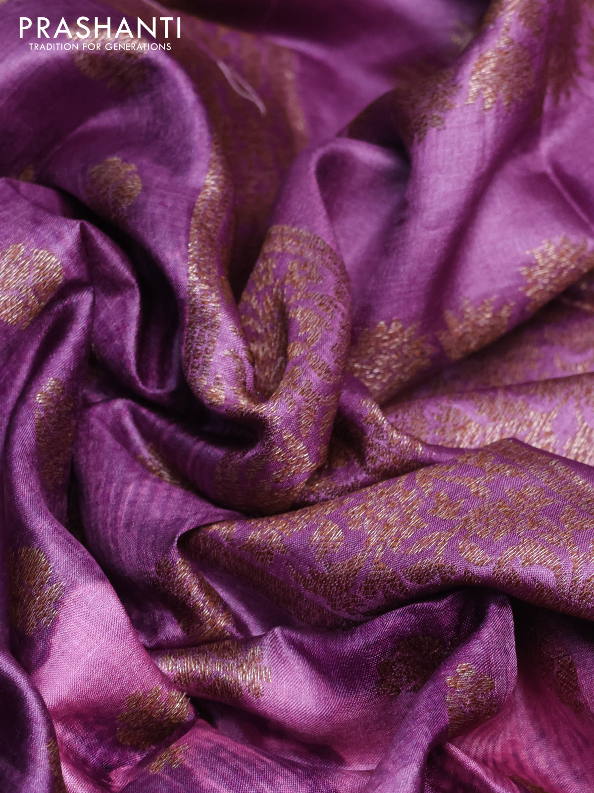 Banarasi tussar silk saree purple shade with woven buttas & floral digital prints and piping border