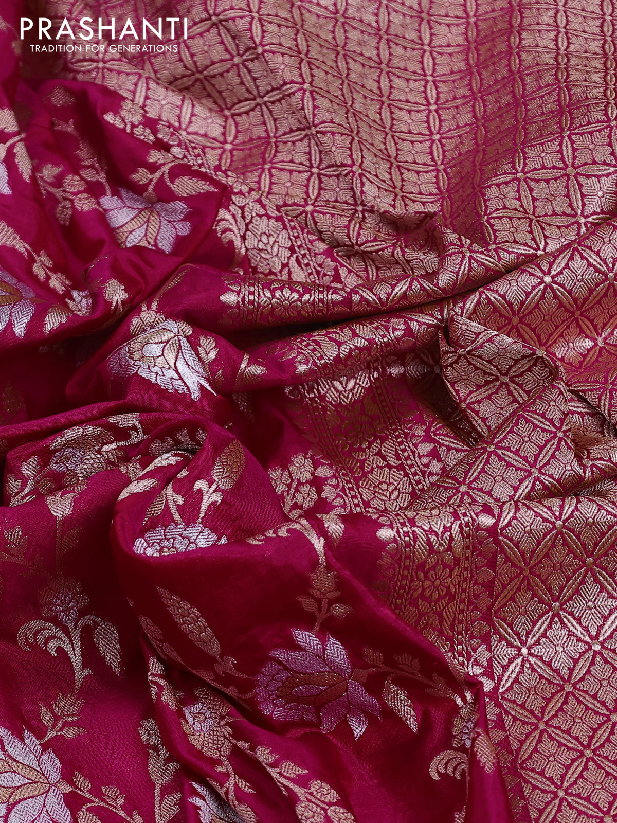 Banarasi uppada silk saree pink with allover silver & gold zari woven floral brocade weaves and zari woven border