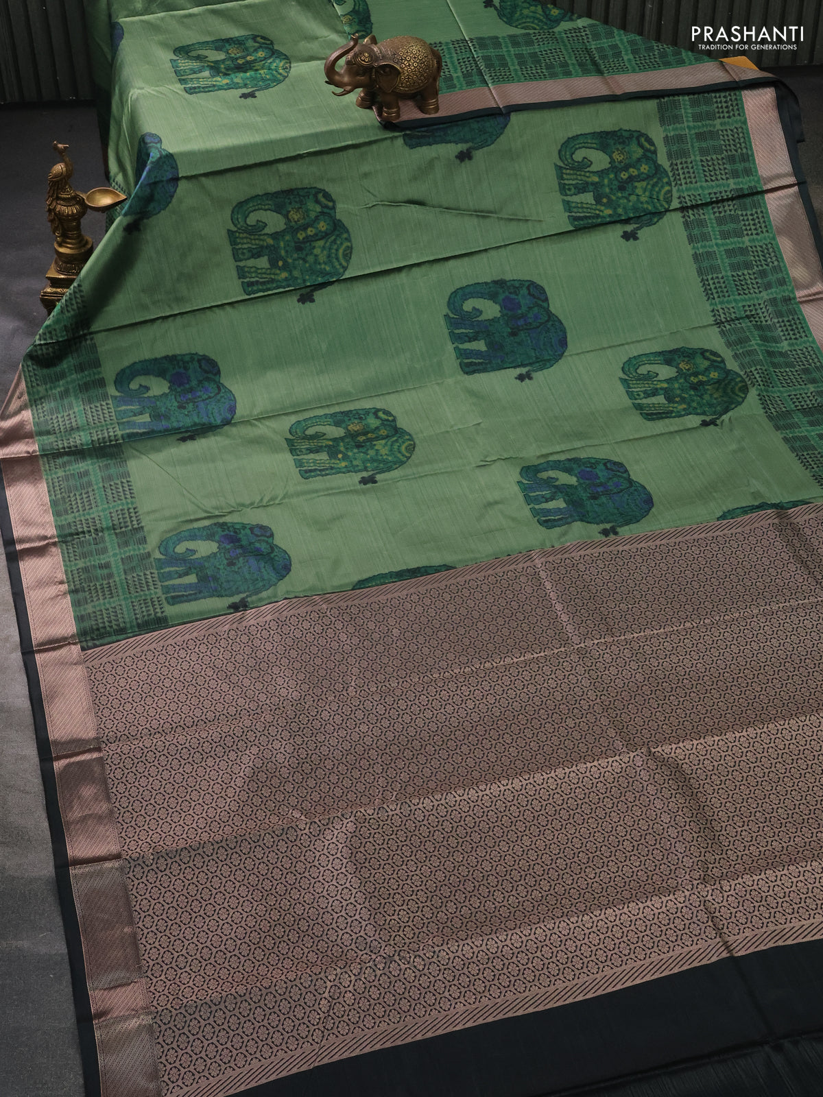 Bangalori semi silk saree green and dark peacock green with allover elephant ikat butta weaves and zari woven border
