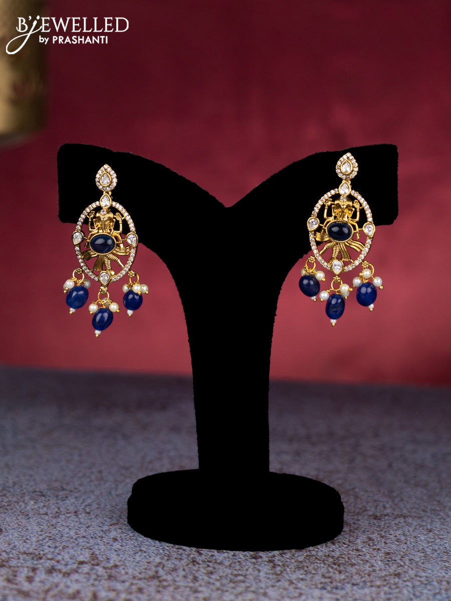Beaded blue necklace ganesha pendant with sapphire & cz stones and pearl & beads hangings in victorian finish