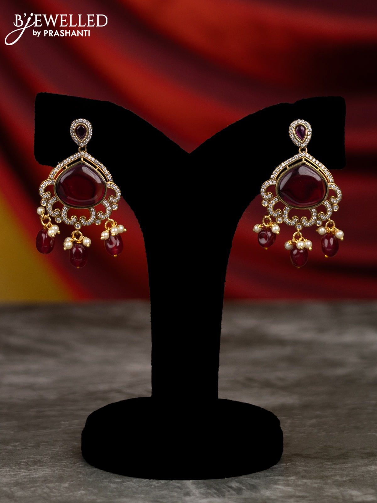 Beaded triple layer maroon necklace lakshmi design with ruby & cz stones and pearl & beads hangings in victorian finish