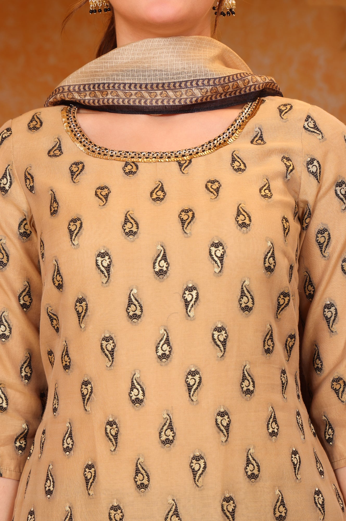 Beige Ethnic Motifs Beads Embellished Straight Jacquard Kurta, Trouser and Dupatta Set