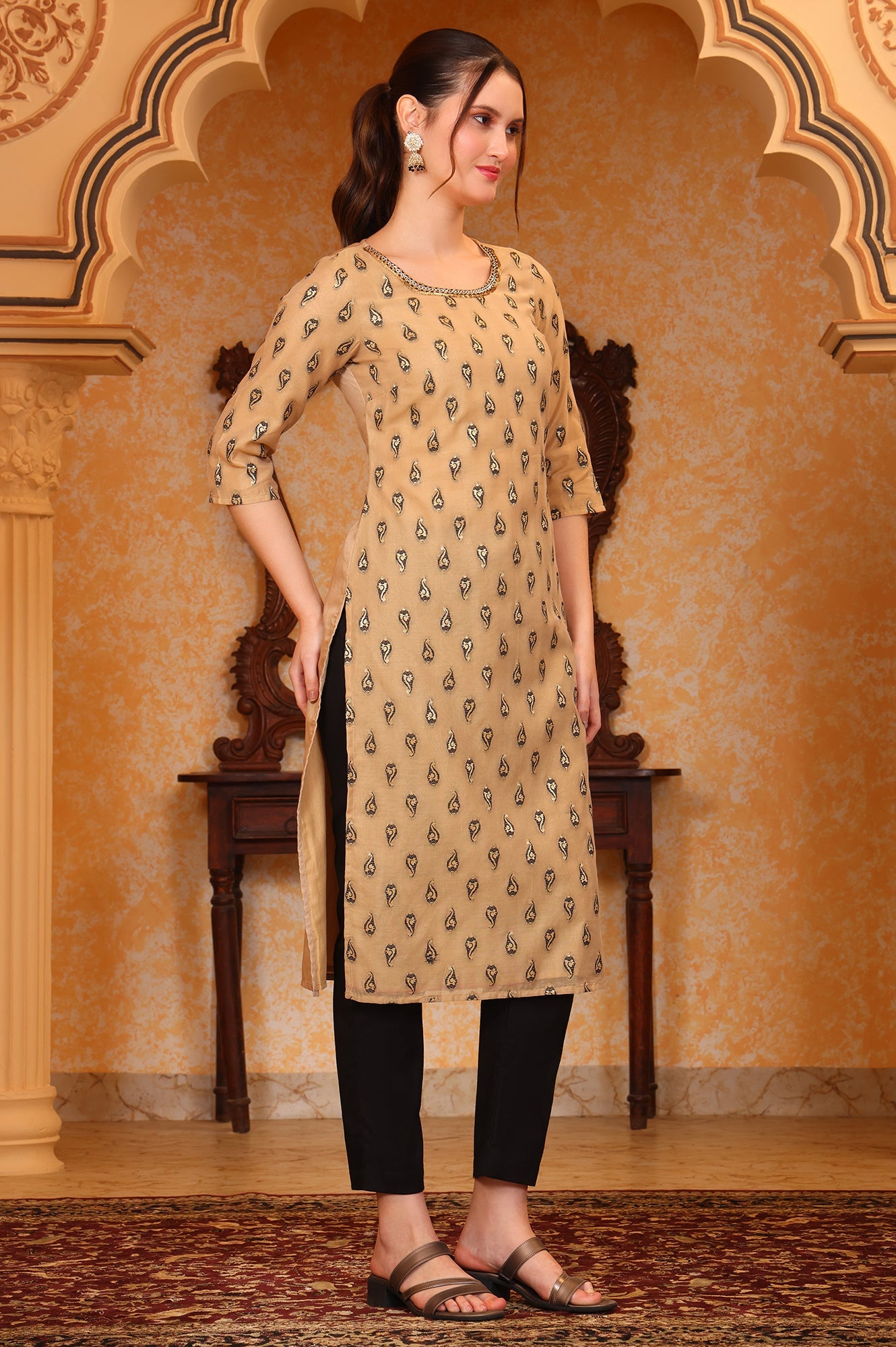 Step into festive elegance with Aurelia’s beige ethnic motifs kurta set, a harmonious blend of tradition and modernity. The jacquard kurta, adorned with delicate bead embellishments, features a straight silhouette and side slits for effortless movement. Paired with black cotton trousers, designed with a mid-rise waist and functional pockets, this set offers both style and practicality. The abstract-patterned polyester dupatta adds a touch of contemporary flair, completing the ensemble. Perfect for festive occasions, cultural events, or evening gatherings, this kurta set embodies sophistication and comfort. Pair it with statement earrings and metallic sandals for a polished look that celebrates Indian craftsmanship and sustainable design.
