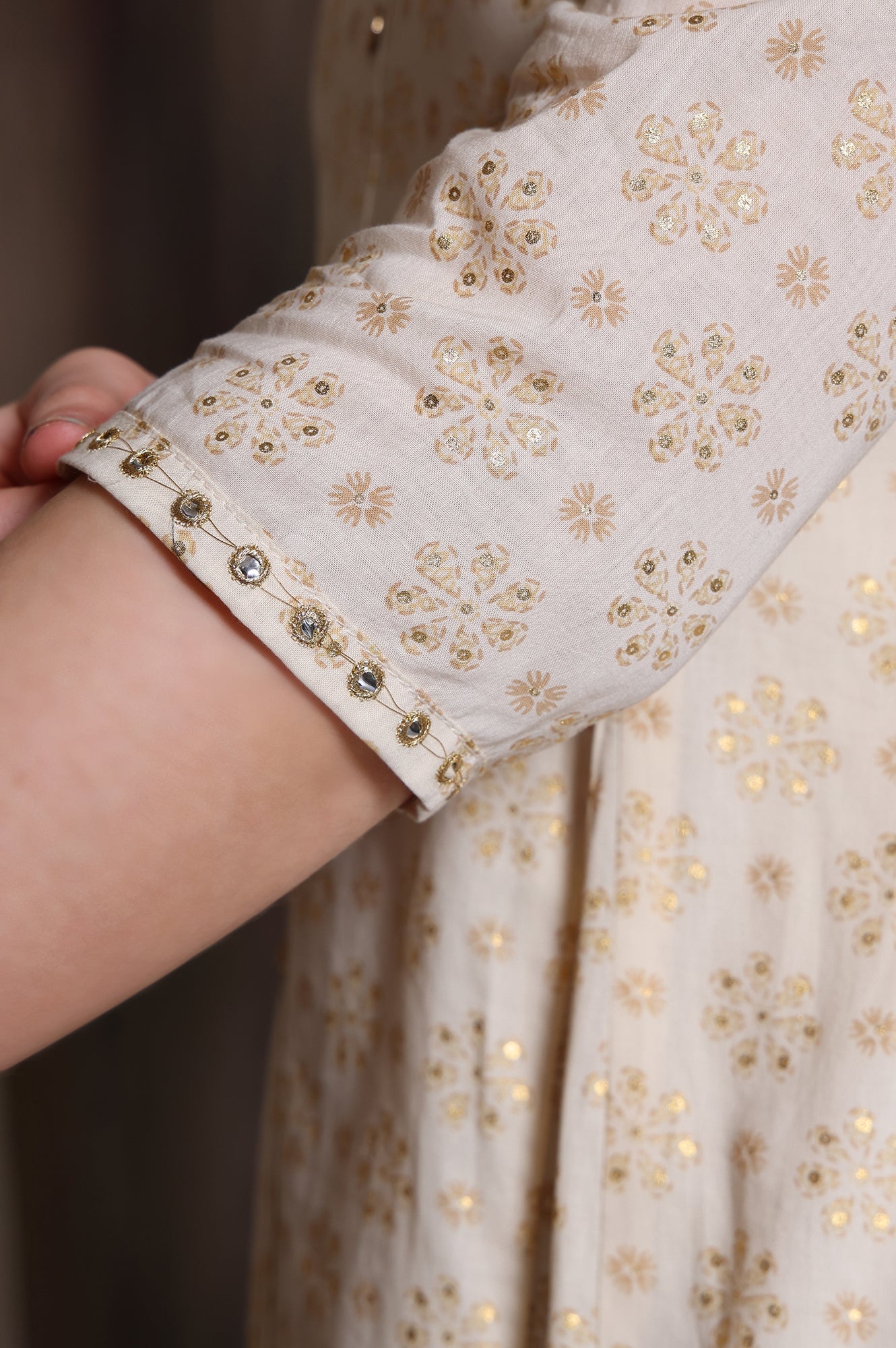 Beige Foil Printed Zari Embellished Anarkali Cotton Kurta and Legging Set