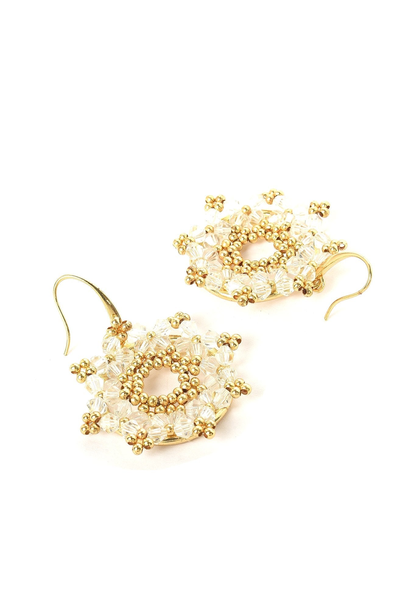 Delicately Crafted Beige Hoop Earring With Golden Jhumki And Detailed Beadwork