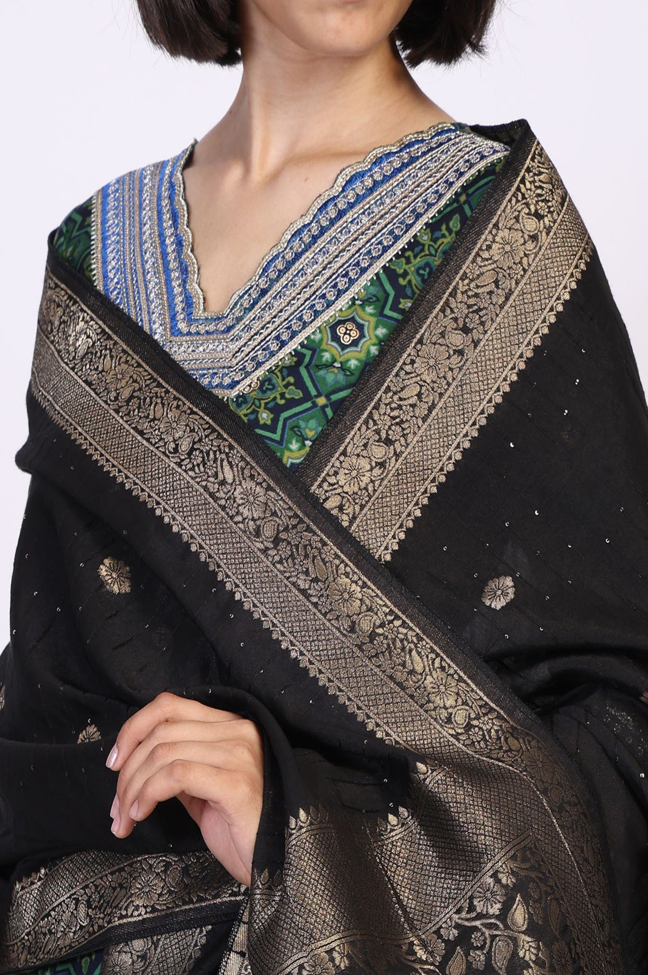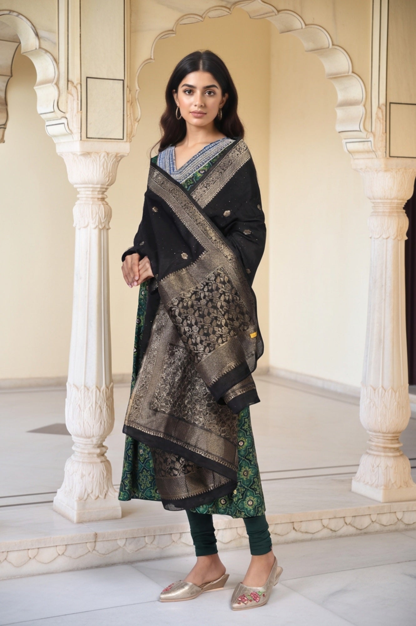 A shadow woven with golden light, this stunning designer dupatta for women in classic Black is a masterpiece of textile art. The main body, a canvas of semi-sheer fabric, is thoughtfully dotted with delicate woven buttis that catch the light with every movement. This ethnic dupatta finds its true splendor in the magnificent, wide border, where a dense jacquard weave brings intricate floral and traditional motifs to life using shimmering zari threads. It's a festive woven stole that tells a story of heritage craftsmanship. Offering a graceful drape, its generous length of over two meters and ample width allow for versatile, elegant styling. Whether draped as a classic stole or a traditional wrap, it floats effortlessly, the opulent border providing a beautiful, regal contrast. It's the perfect lightweight party dupatta for festive celebrations, weddings, or any grand occasion. This black jacquard dupatta with zari border is an heirloom-quality piece that adds a touch of royal elegance and sophisticated charm to any wardrobe.