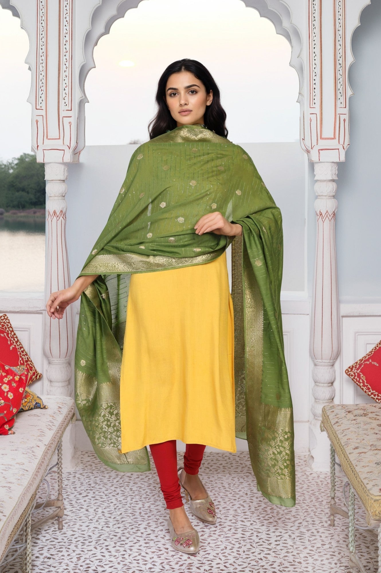 Woven with timeless grace, this ethnic dupatta for women is a masterpiece of traditional textile art. The rich Green canvas is brought to life with delicate, all-over floral buttis, meticulously crafted using a classic Jacquard weave. This designer dupatta is framed by a magnificent, wide border showcasing intricate Zari work that lends it a regal shimmer with every movement you make. Measuring a generous 2.25 meters long and 34 inches wide, this opaque stole drapes beautifully over your shoulders, its substantial yet surprisingly soft feel perfect for making a statement at grand occasions. You'll find it’s the ideal accessory to elevate your favorite kurtas and lehengas, making it perfect for weddings, festivals, and celebratory gatherings. Pair this stunning green jacquard dupatta with a contrasting outfit to let its artistry truly shine. As a versatile scarf-style wrap, it's a treasure you'll reach for season after season.