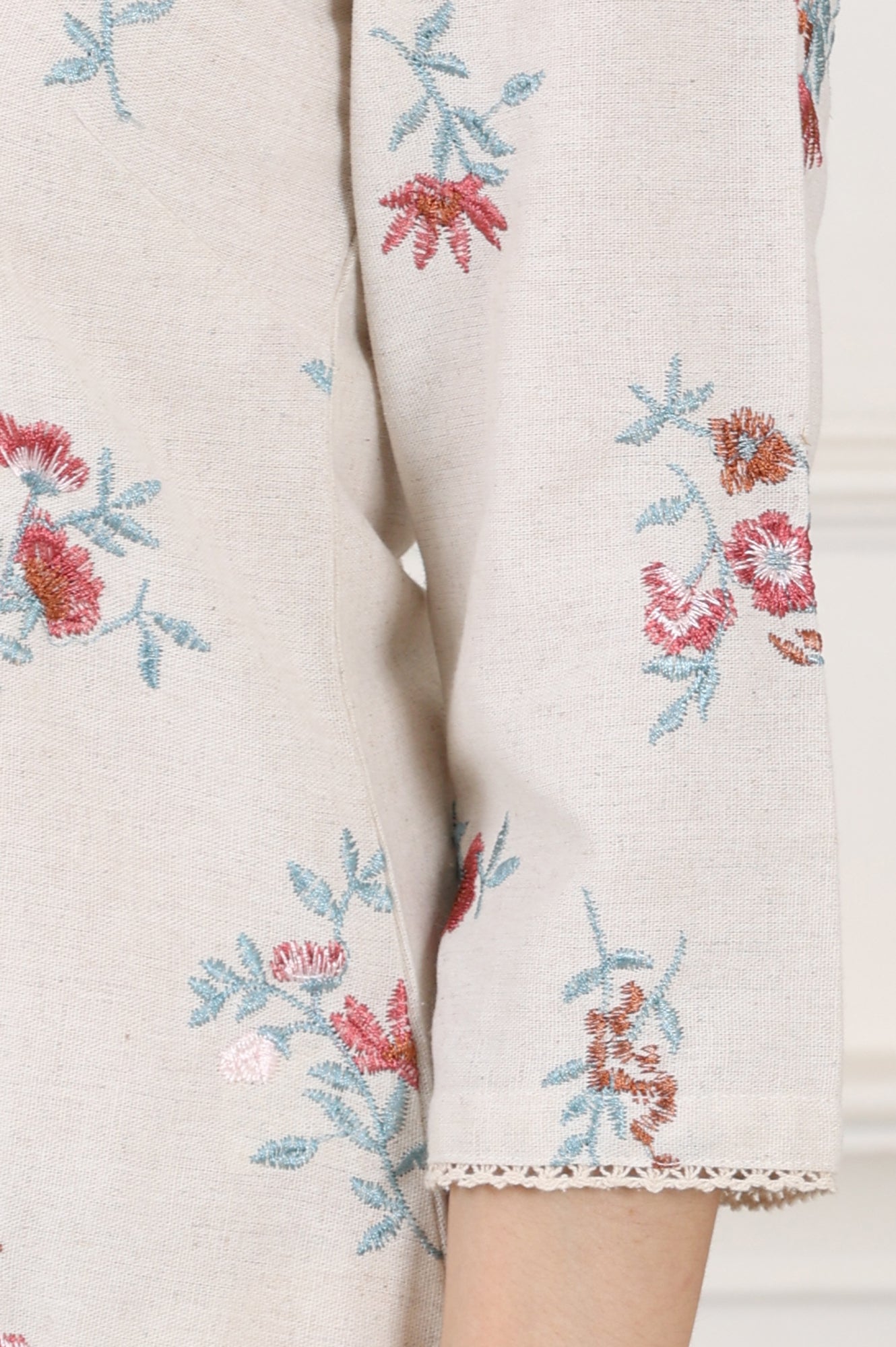 Beige Linen Straight Kurta With Multi-Coloured Thread Work