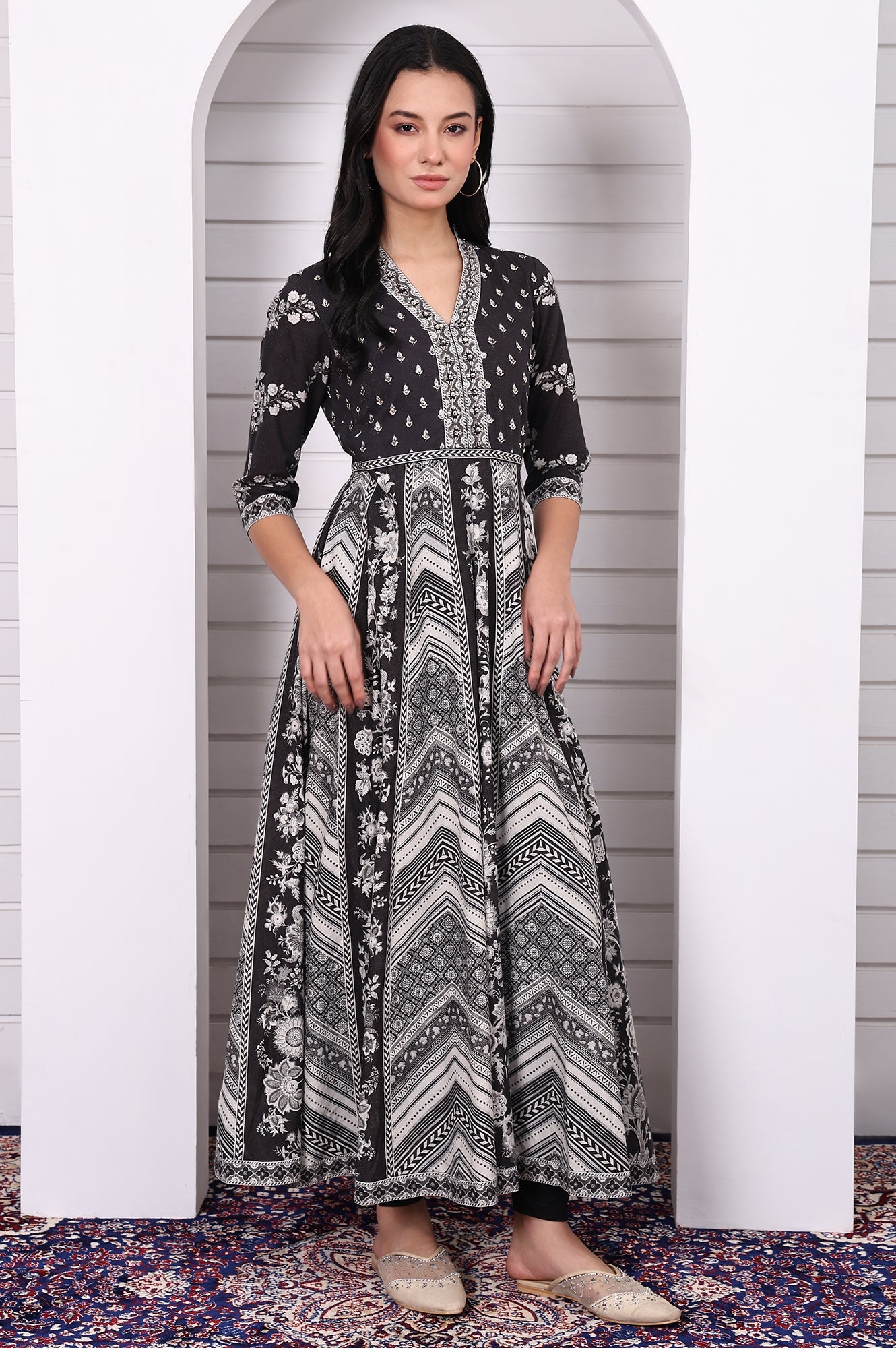 This black flared kurta set features hand work detailing and abstract prints that bring edge to festive styling. The flowy silhouette pairs with sleek leggings and a matching dupatta, offering a bold option for celebrations or evening gatherings.