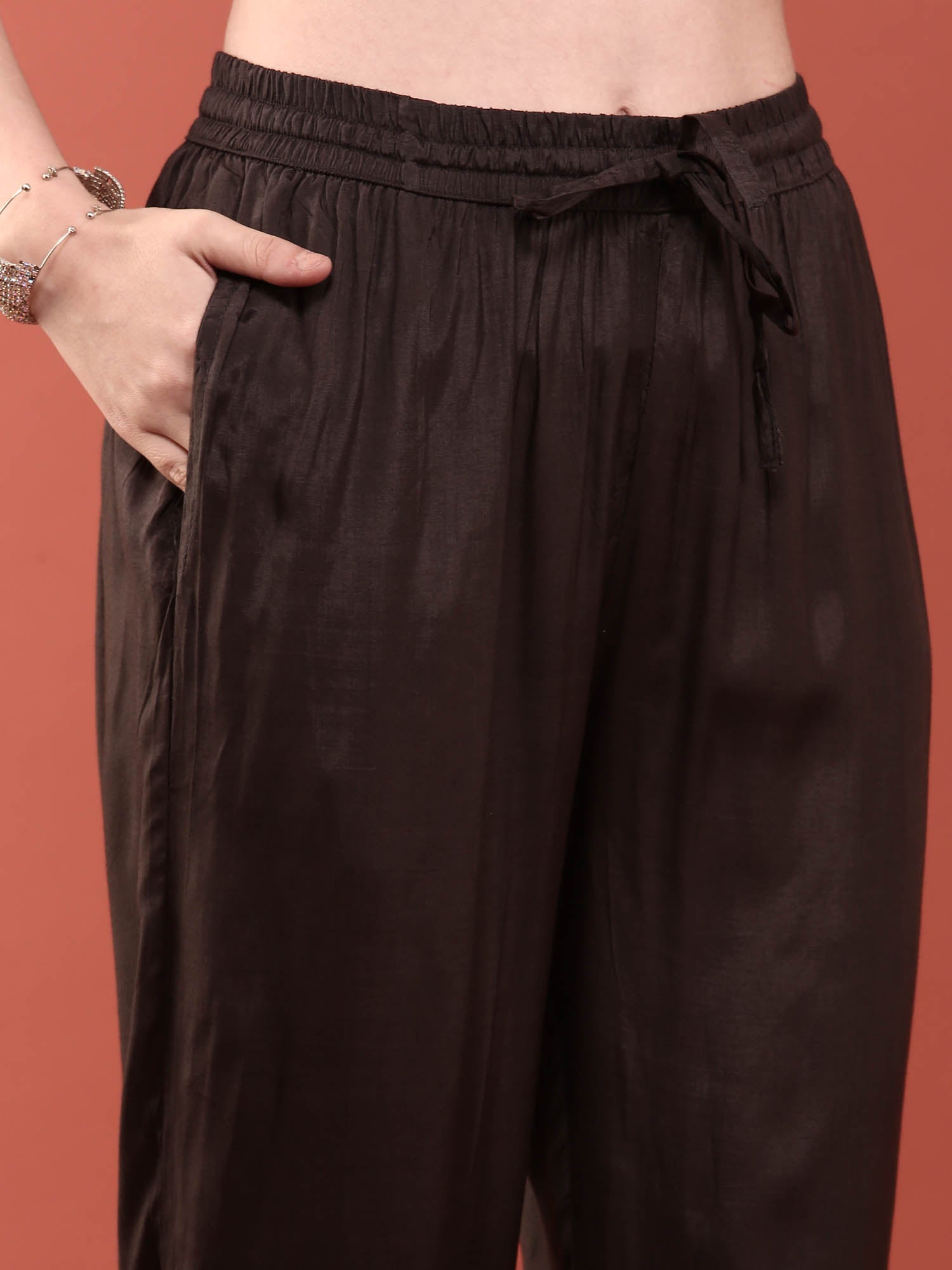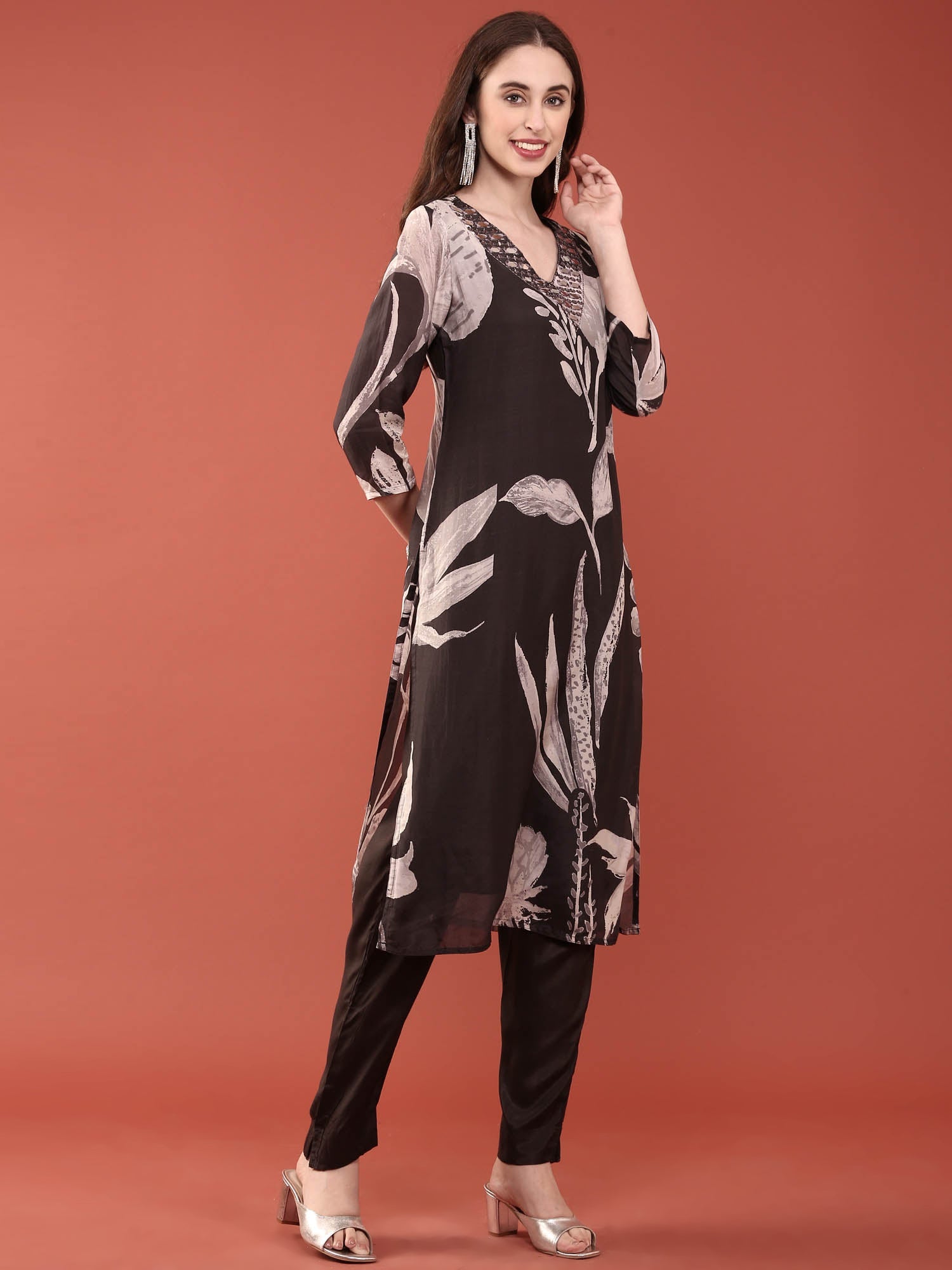 Elevate your ethnic wardrobe with this sophisticated Black Dola Silk Digital Print Three Piece Set. Crafted from premium dola silk, known for its luxurious drape and subtle sheen, this ensemble combines traditional elegance with contemporary design. The intricate digital print adds visual depth and modern flair to the classic silhouette. Perfect for festive occasions, celebrations, or formal gatherings, this versatile set offers the comfort of natural silk fabric while maintaining impeccable structure.