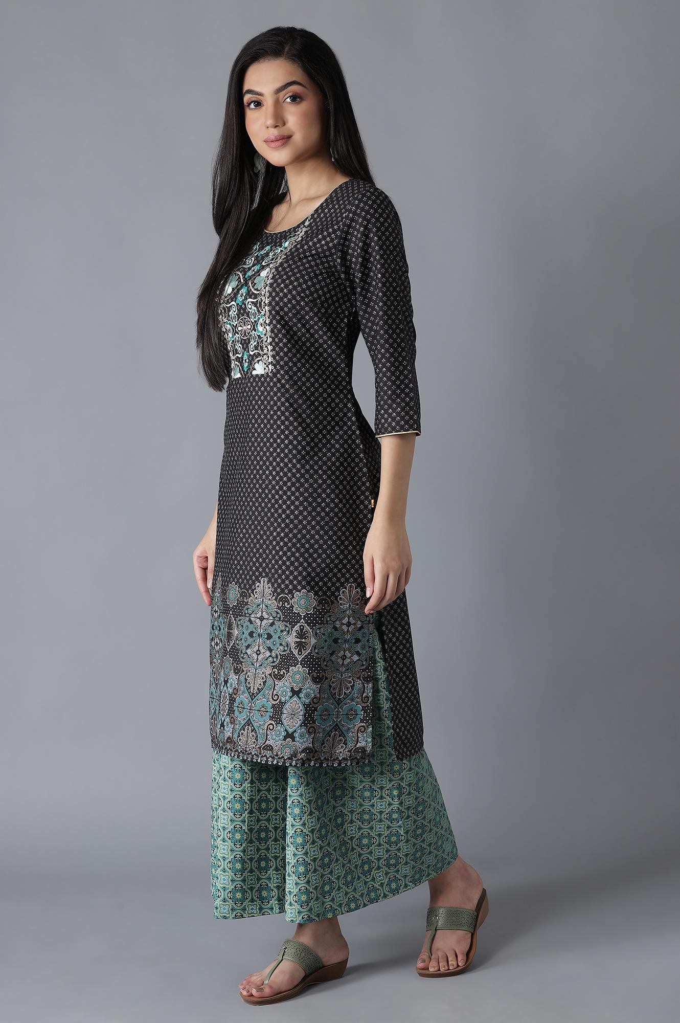 A kurta set laced with elegance to make you look graceful on all occasions. It features a jet black glittered geometric print straight kurta having zari embroidered yoke with round neckline and three-quarter sleeves. Well-matched with green calf length printed flared culottes.