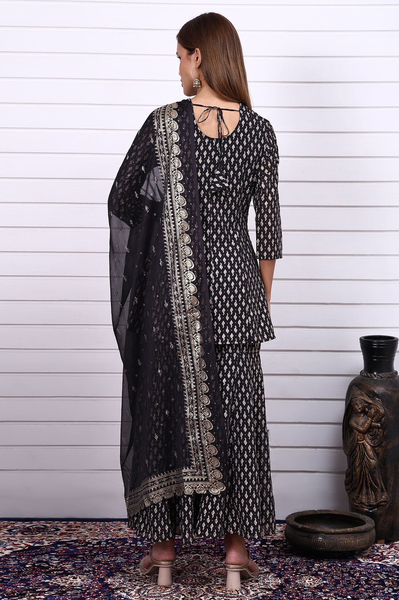 Black Ethnic Motifs Zari Embroidered Flared Kurta, Sharara and Dupatta Set