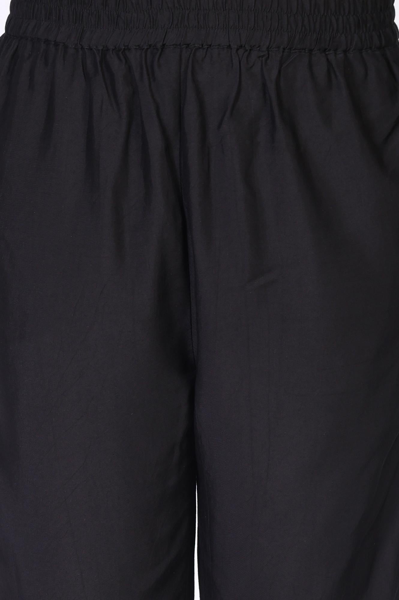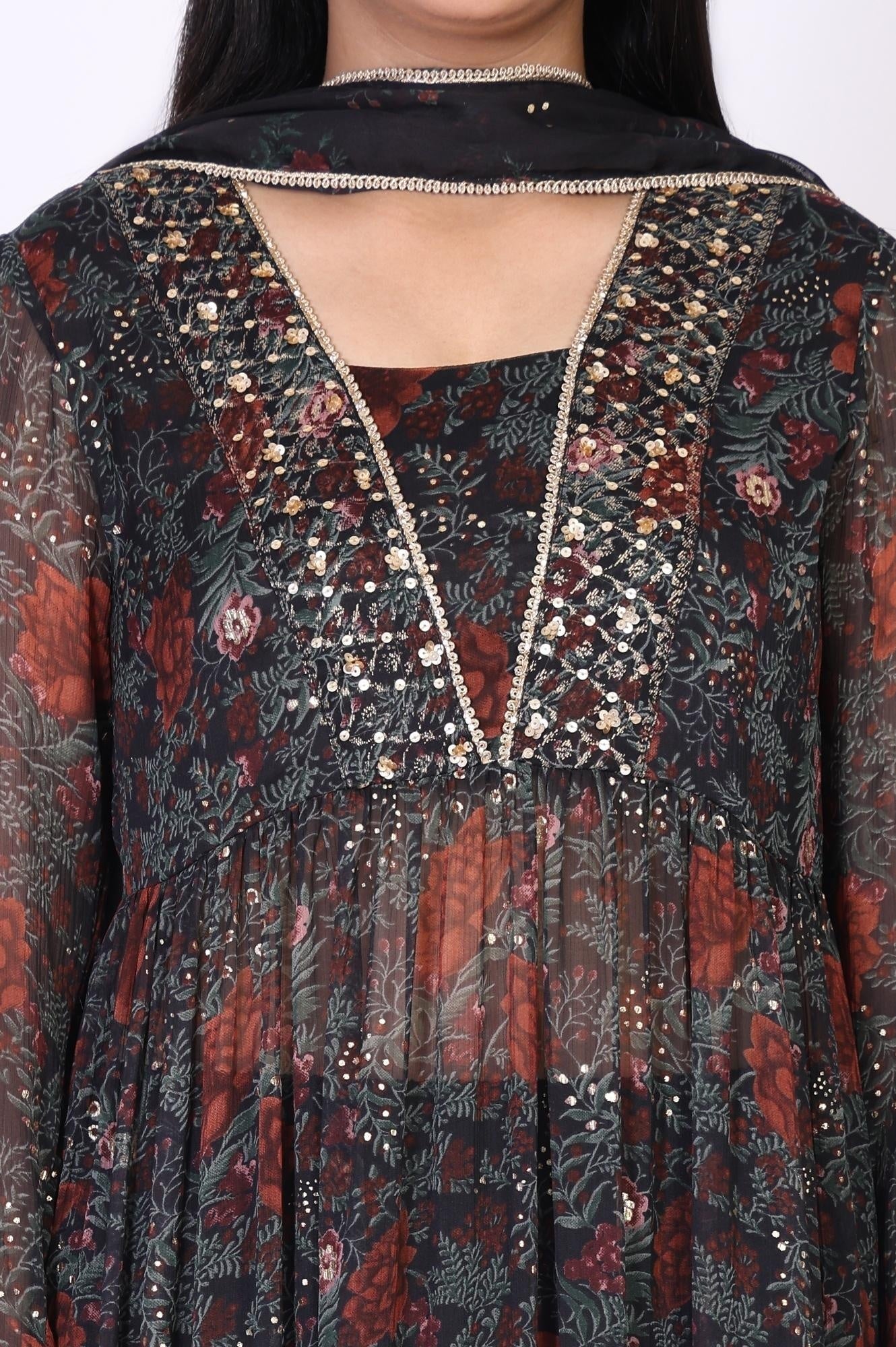 Black Floral Embroidered Anarkali Chiffon Kurta with Straight Pant Set