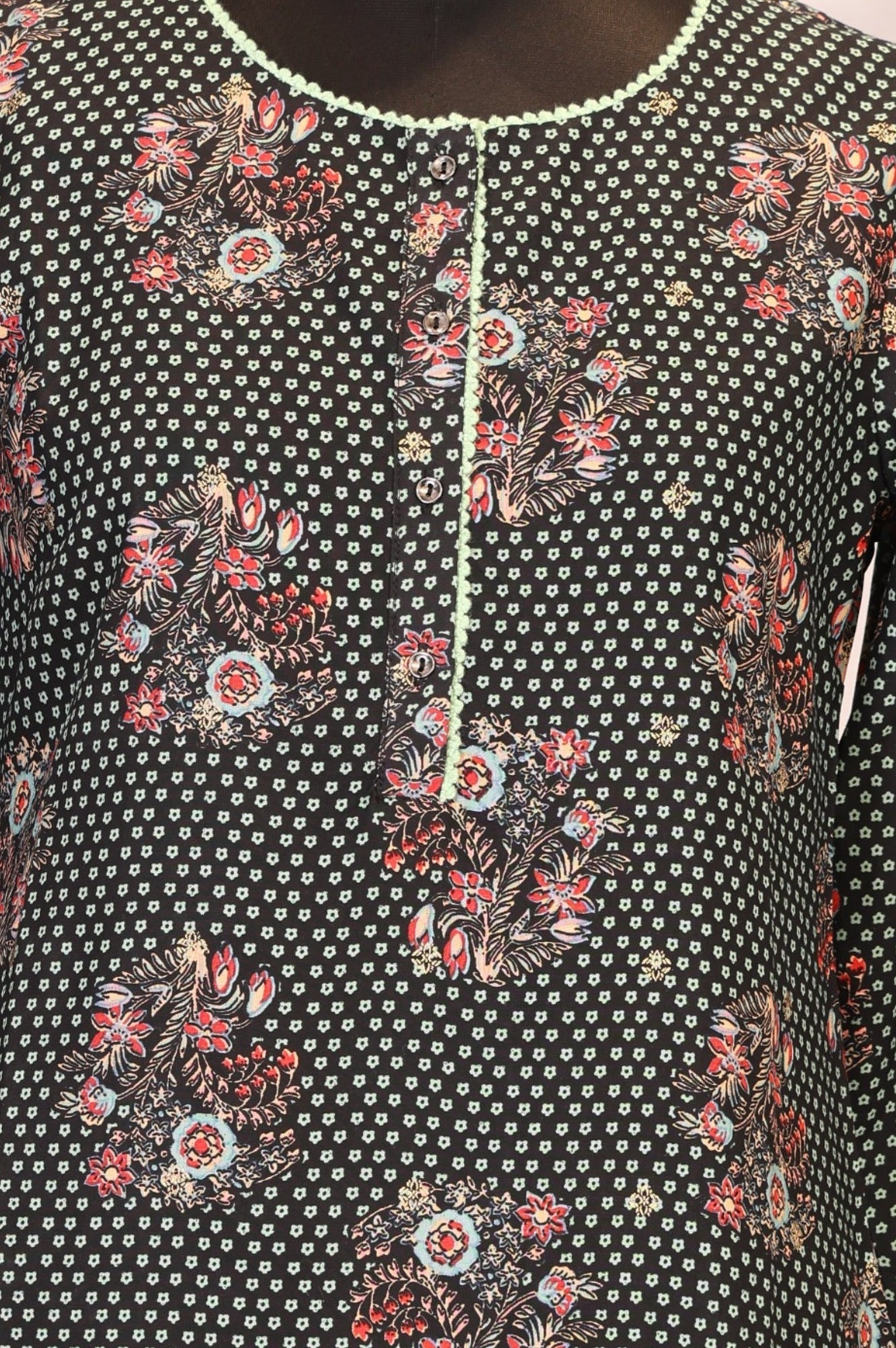 Crisp-yet-fluid elegance awaits you in this stunning piece. This Black Floral Printed Kurta from W for Woman is the epitome of effortless style, designed to seamlessly transition from your morning meeting to an evening gathering. The silhouette that flatters while it flows, this straight-cut kurta is tailored from premium 100% Viscose Rayon, ensuring a soft touch and breathable comfort throughout the Summer 2026 season. Adorned with a captivating all-over print featuring delicate floral bunches and geometric dots, the design radiates a contemporary ethnic vibe. The smart round neckline is accentuated with a faux placket detailing decorative buttons and fresh green piping, adding a hint of contrast to the dark charcoal base. Three-quarter sleeves with matching trim details provide a polished finish, while the classic side slits offer freedom of movement and a traditional touch. This opaque, woven garment requires no lining, making it lightweight and easy to wear. Whether styled with tailored trousers for a professional look or leggings for a casual day out, this kurta is a versatile addition to your wardrobe. Its timeless shape and intricate pattern make it a must-have for the modern woman seeking both fashion and function.