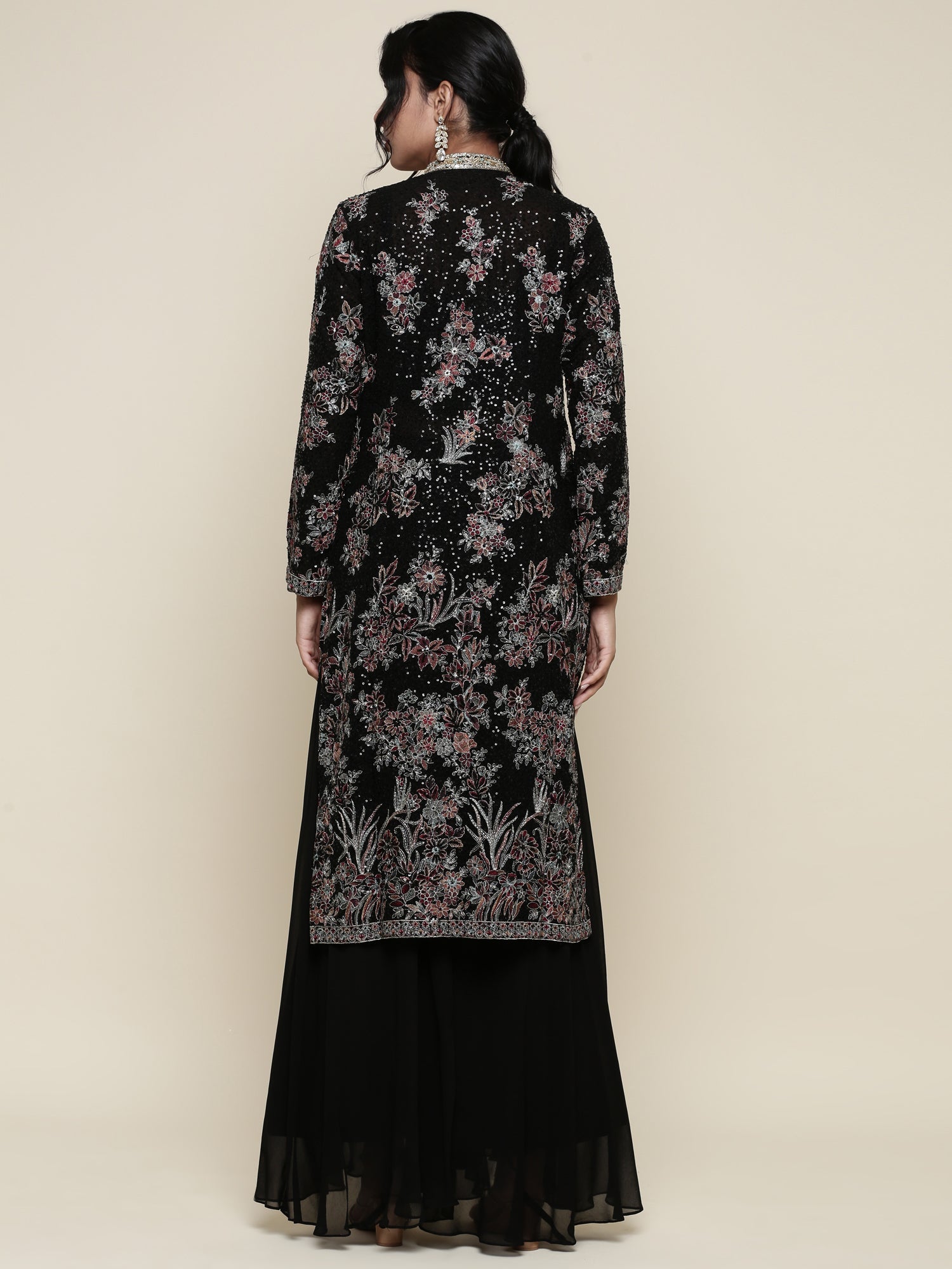 This black georgette ensemble features a finely embroidered crop top jacket paired with stylish palazzos. Crafted from breathable georgette fabric, it combines elegance with comfort, making it perfect for formal events or festive occasions. The intricate embroidery highlights expert craftsmanship, offering a sophisticated yet contemporary look.