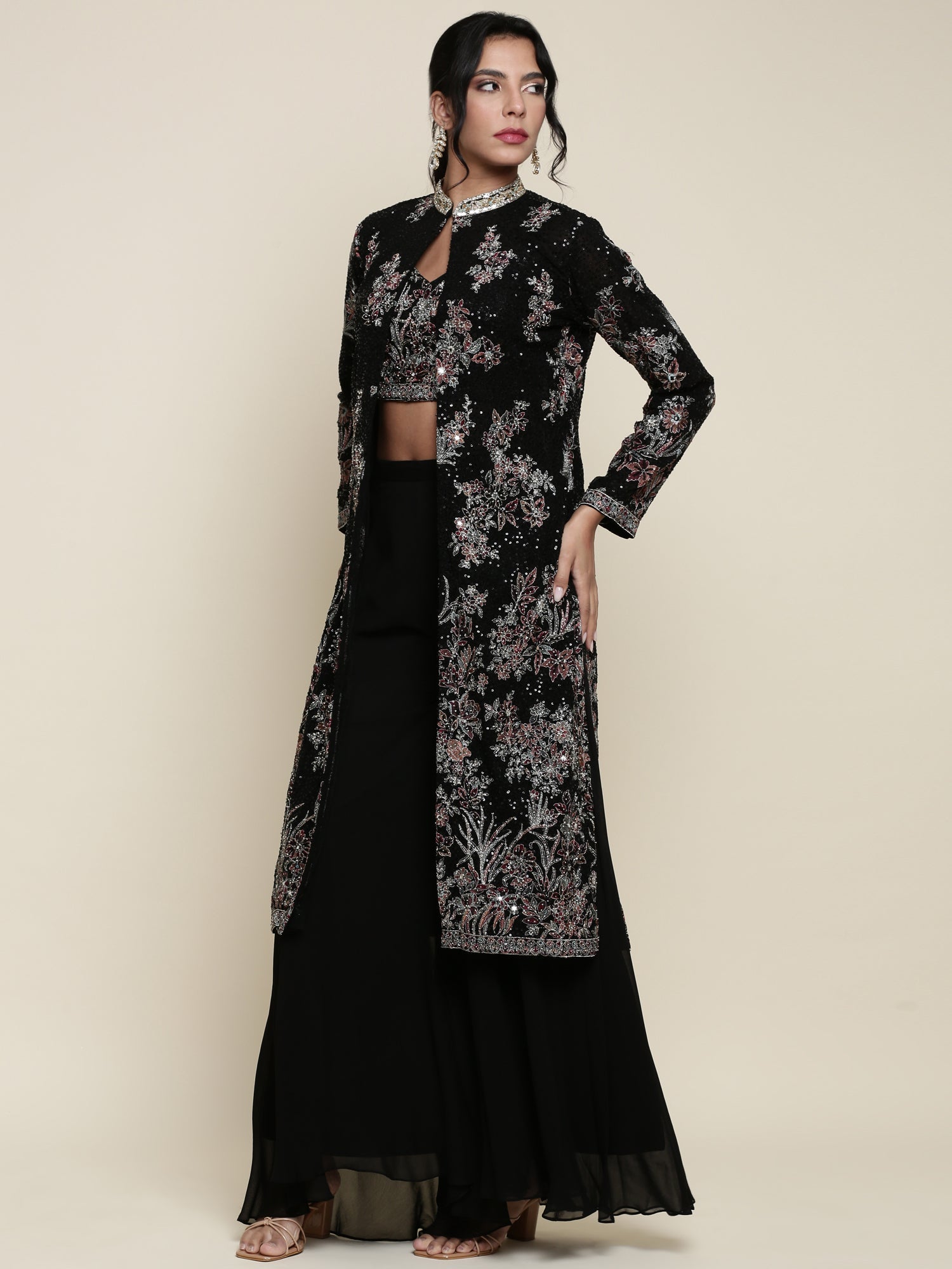 Black georgette embroidered crop top jacket and palazzo set