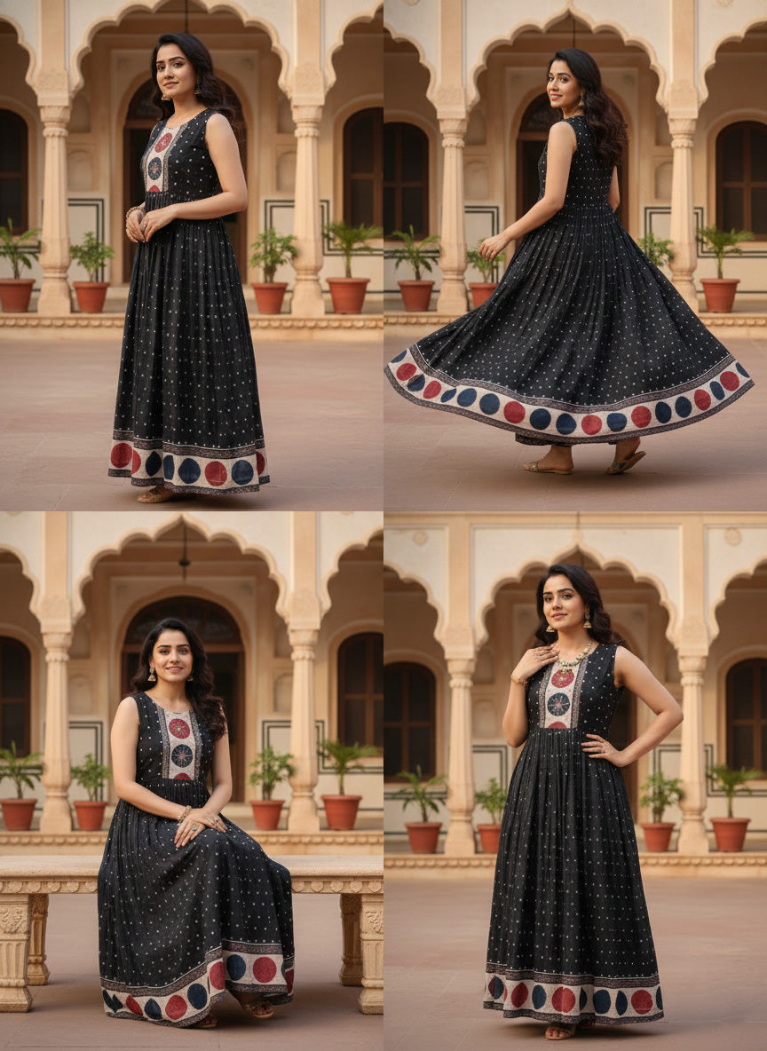 Embrace timeless elegance with this stunning black georgette printed long dress. Crafted from lightweight, breathable georgette fabric, this piece drapes beautifully and moves with grace. The intricate printed design adds visual interest while the classic black base ensures versatility for any occasion. Perfect for festive celebrations, evening gatherings, or sophisticated everyday wear, this dress combines comfort with refined style. The flowing silhouette flatters all body types, making it an essential addition to your wardrobe.
