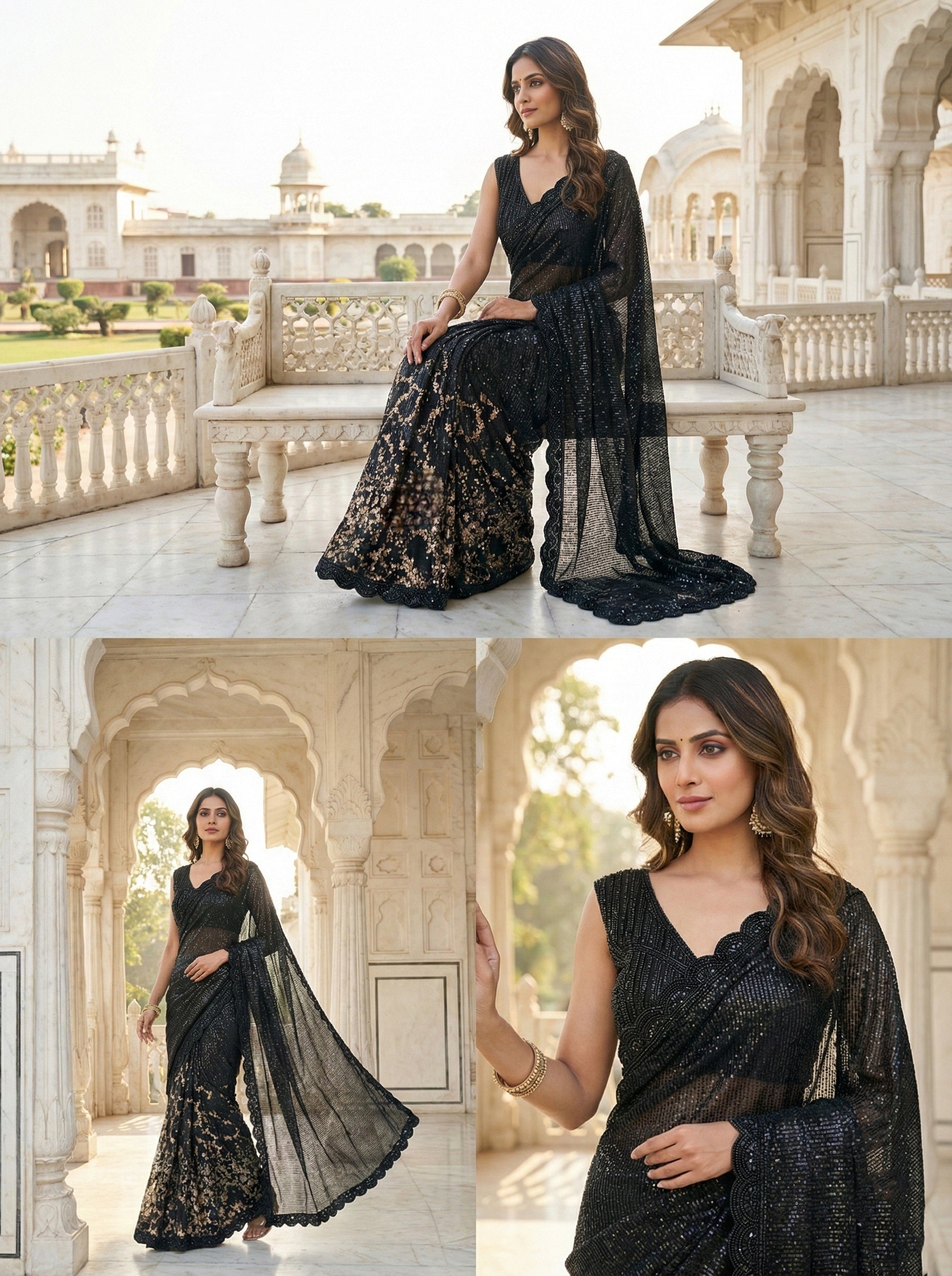 Elevate your ethnic wardrobe with this stunning black net saree, meticulously crafted with heavy sequins and intricate stone embellishments. The luxurious draping fabric showcases exquisite detailing that catches light beautifully, making it perfect for weddings, celebrations, and special occasions. Paired with a coordinated readymade blouse, this saree offers effortless elegance and convenience. The sophisticated black backdrop allows the shimmering embroidery to take center stage, creating a timeless look that exudes grace and refinement. Ideal for those who appreciate traditional craftsmanship with contemporary styling.