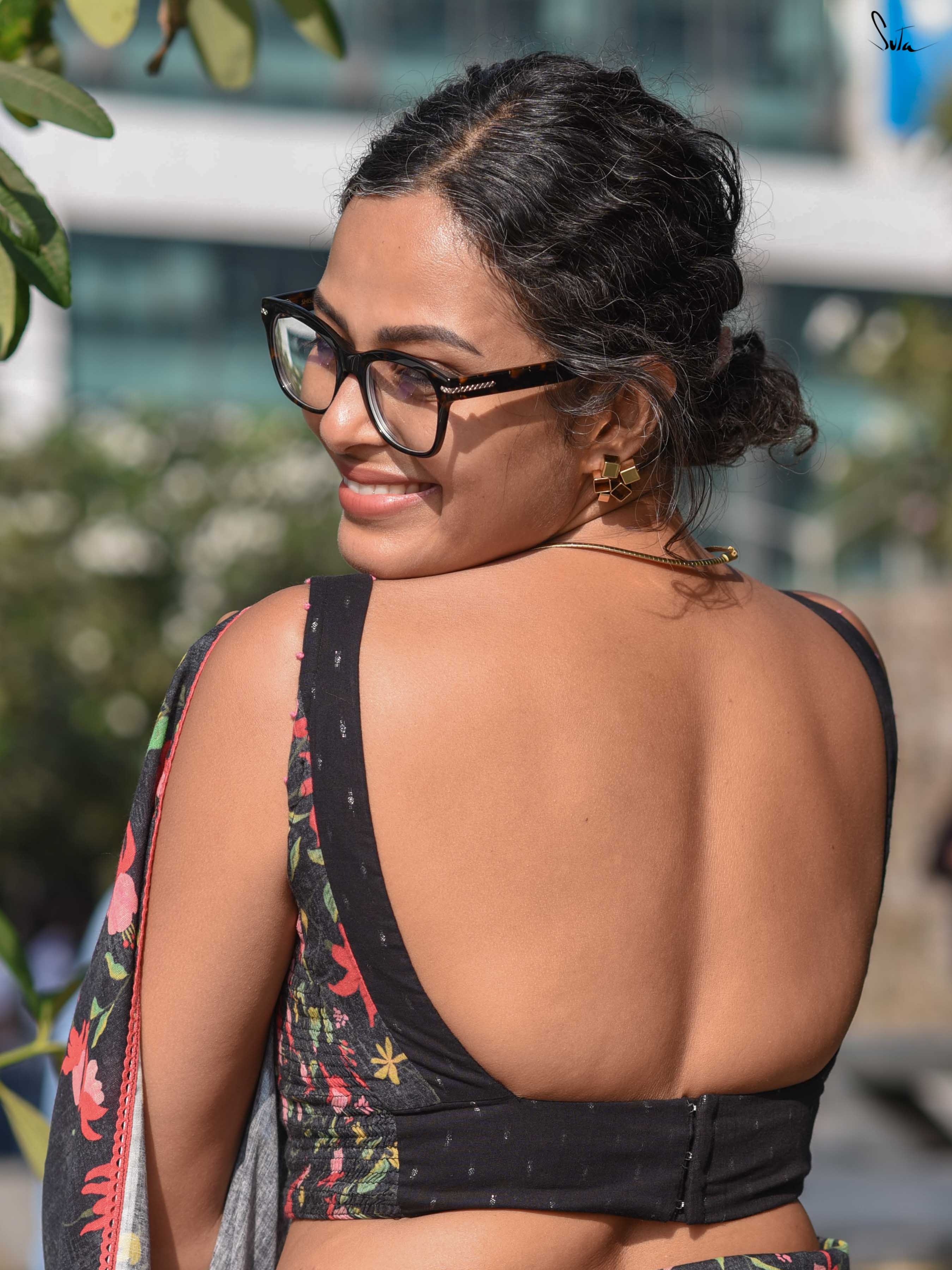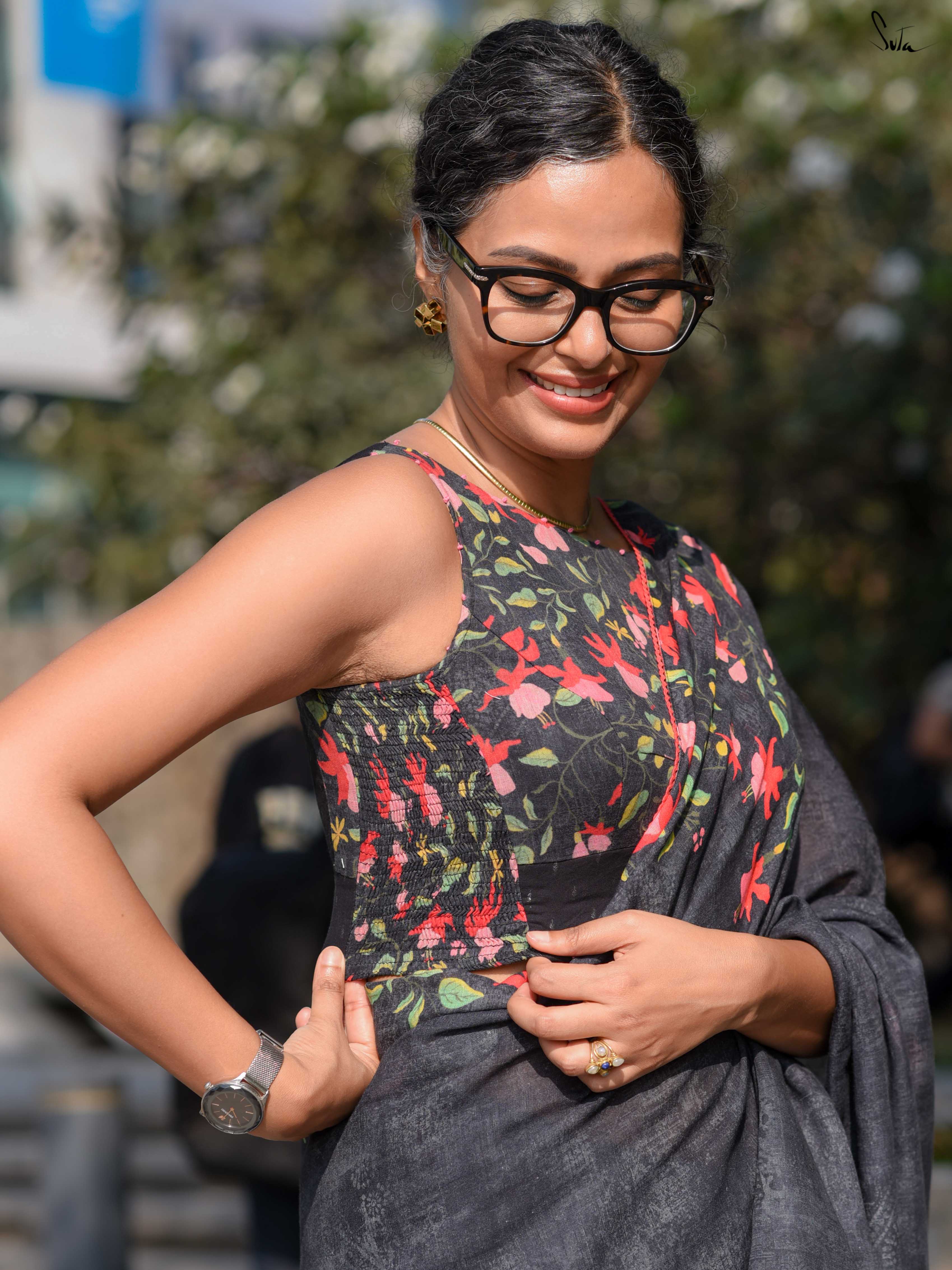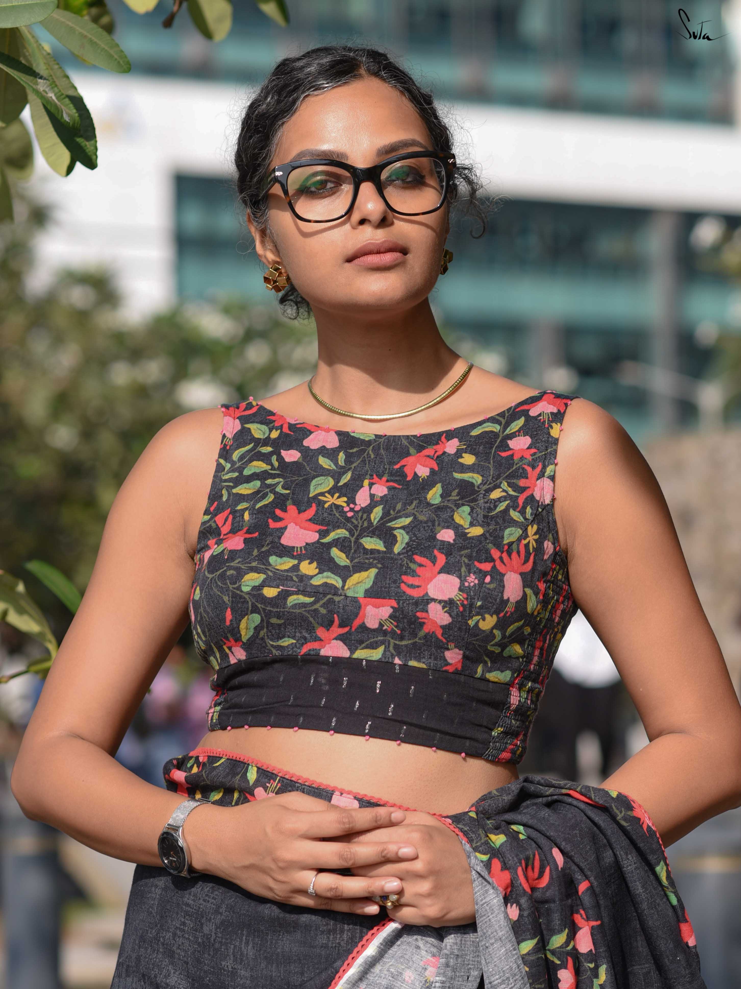 The model is wearing size S blouse and the saree is Black Fuchsia Fiza.