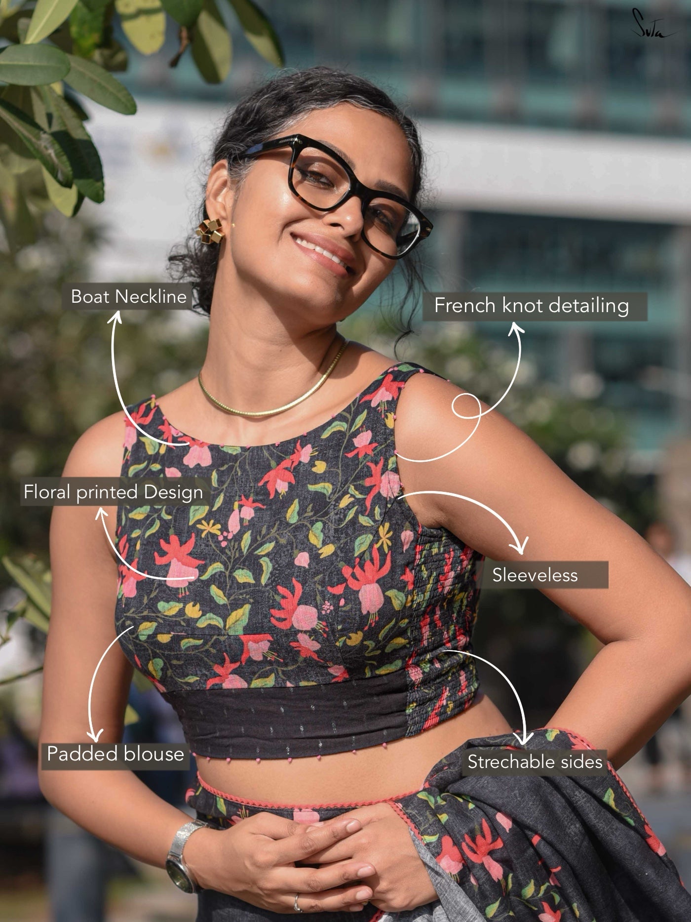 It features a black base with digital floral prints, paired with a classic boat neckline. Delicate French knot detailing on the neckline and sleeves adds a subtle handcrafted touch. The sleeveless silhouette keeps it light and fuss-free.