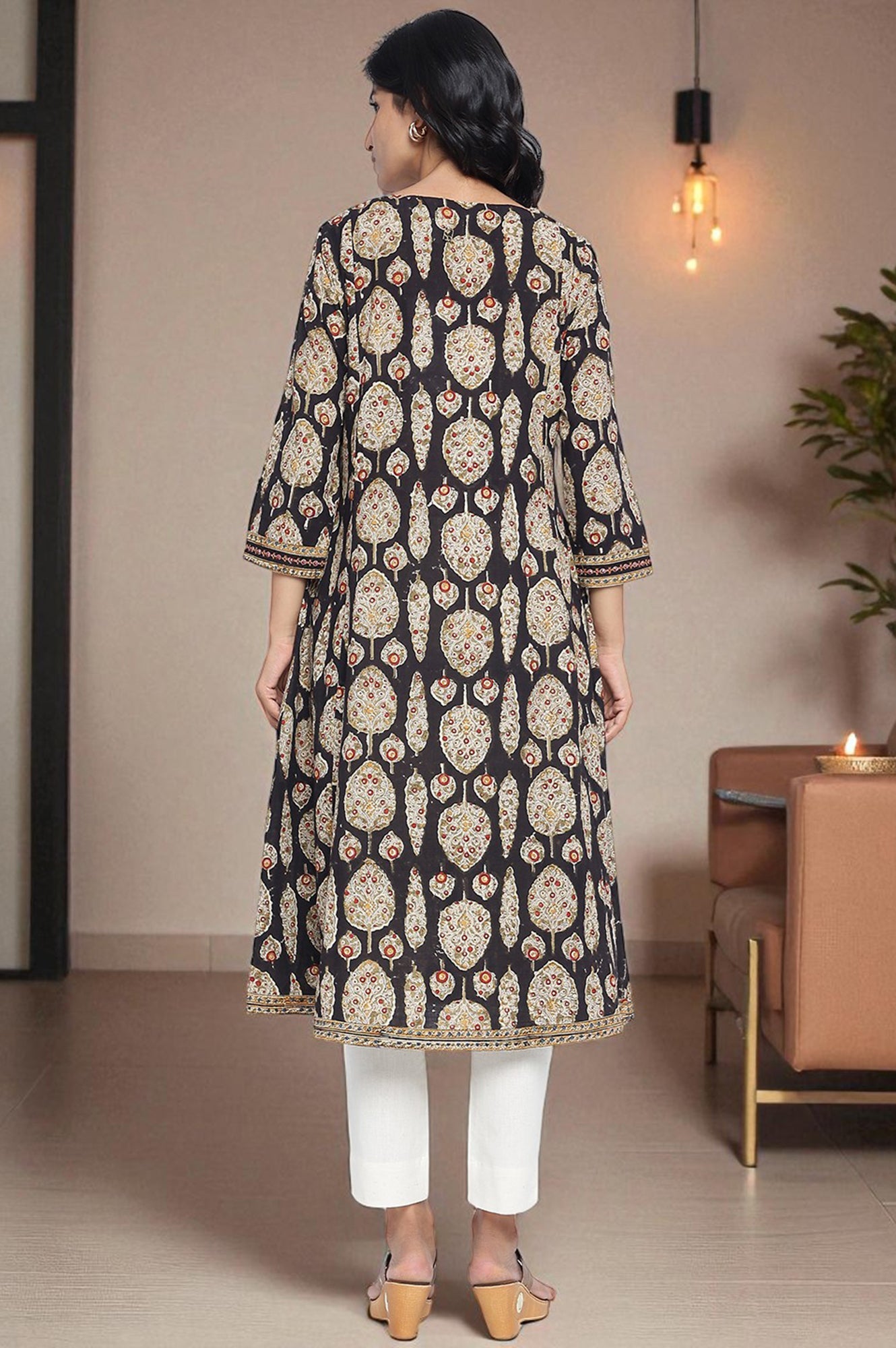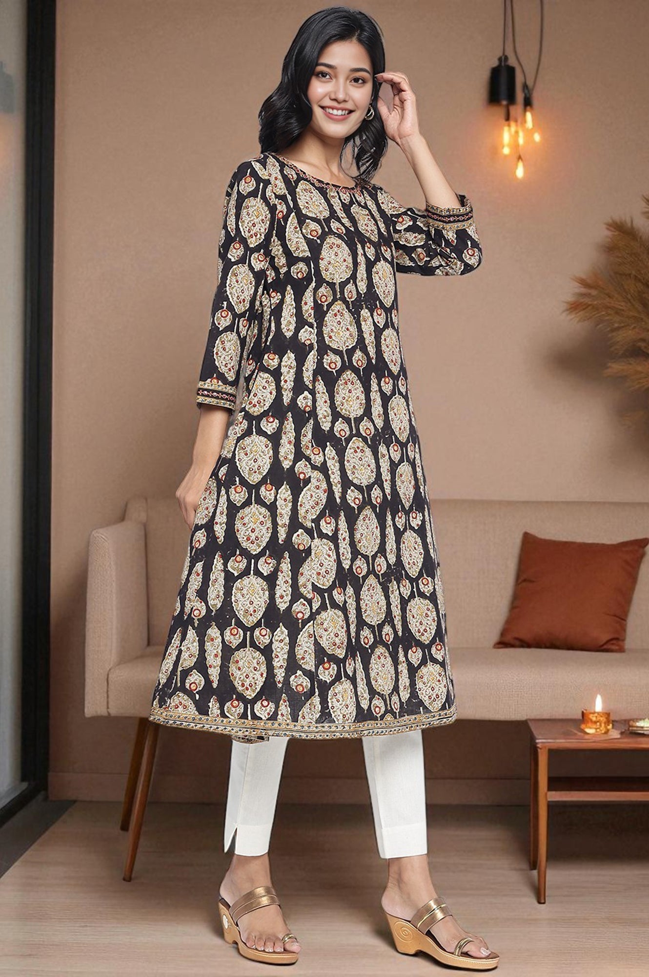 Bring effortless charm to your everyday ethnic wardrobe with this flared kurta in breathable pure cotton. Featuring subtle prints in a rich black hue, this kurta blends traditional elegance with contemporary flair. The flared silhouette offers ease of movement and a flattering fit, making it ideal for long days at work or festive family gatherings. Thoughtfully crafted with fine detailing, it ensures comfort without compromising on style. Whether paired with leggings or palazzos, this kurta for women will elevate your seasonal dressing. It’s a timeless pick for those who love easy elegance in pure cotton.