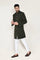 This sherwani set has black rayon top with buttons and collar neck with embellishment paired with white rayon pants which emits luxurious appearance makes it ideal for any occasion.