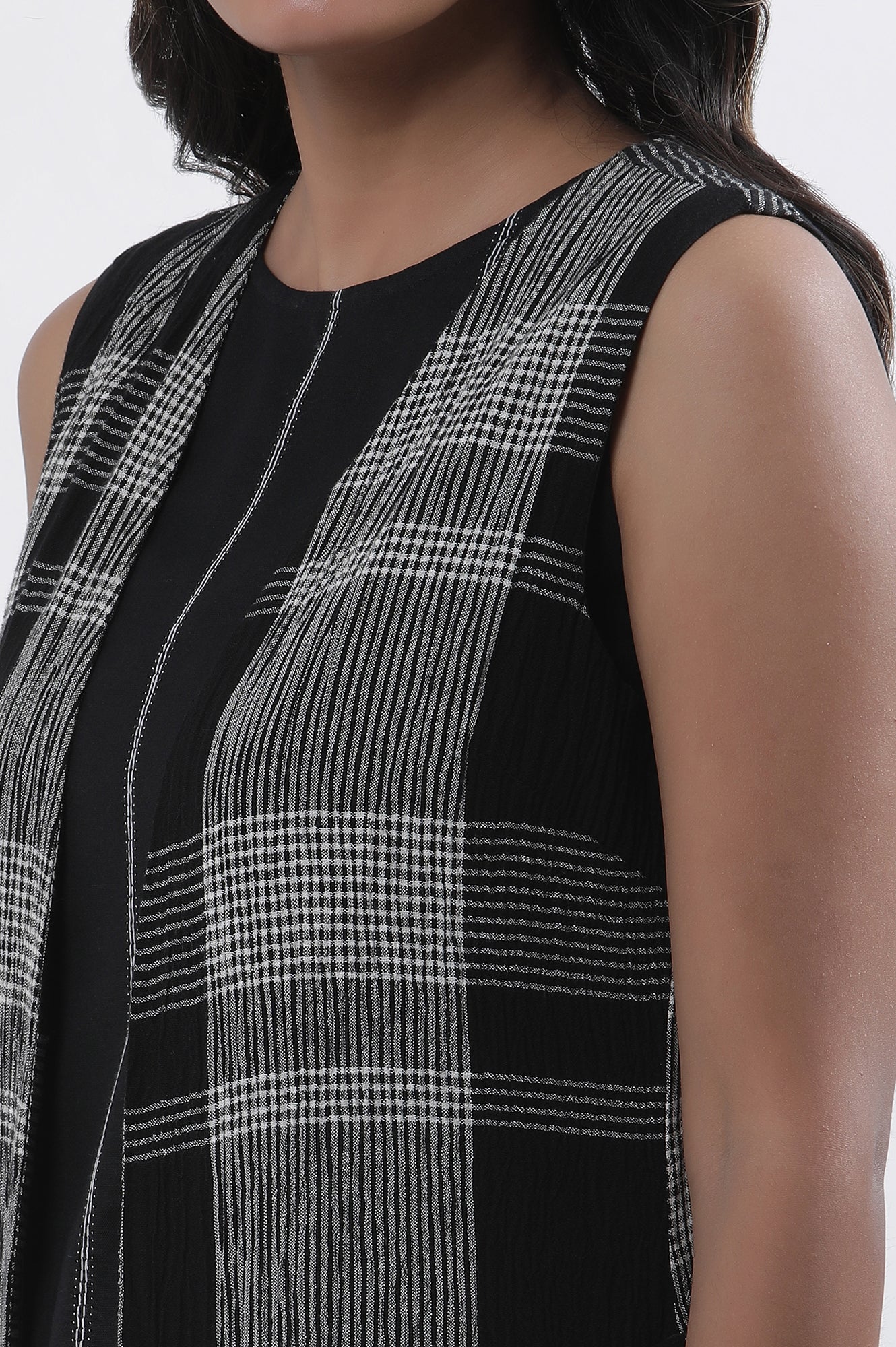 Step into structured elegance with this black co-ord set featuring a sleeveless A-line top, tailored pants and a checker print jacket. Designed for statement dressing, the monochrome palette and layered design create a refined yet modern look. Ideal for work events, dinners, or when you want to make an impression, this three-piece set is versatile and polished. The longline jacket adds definition to the outfit while the sleeveless top and pants keep it breathable. Whether worn together or styled separately, each piece offers contemporary appeal. Add this W set to your wardrobe for that effortless edge.