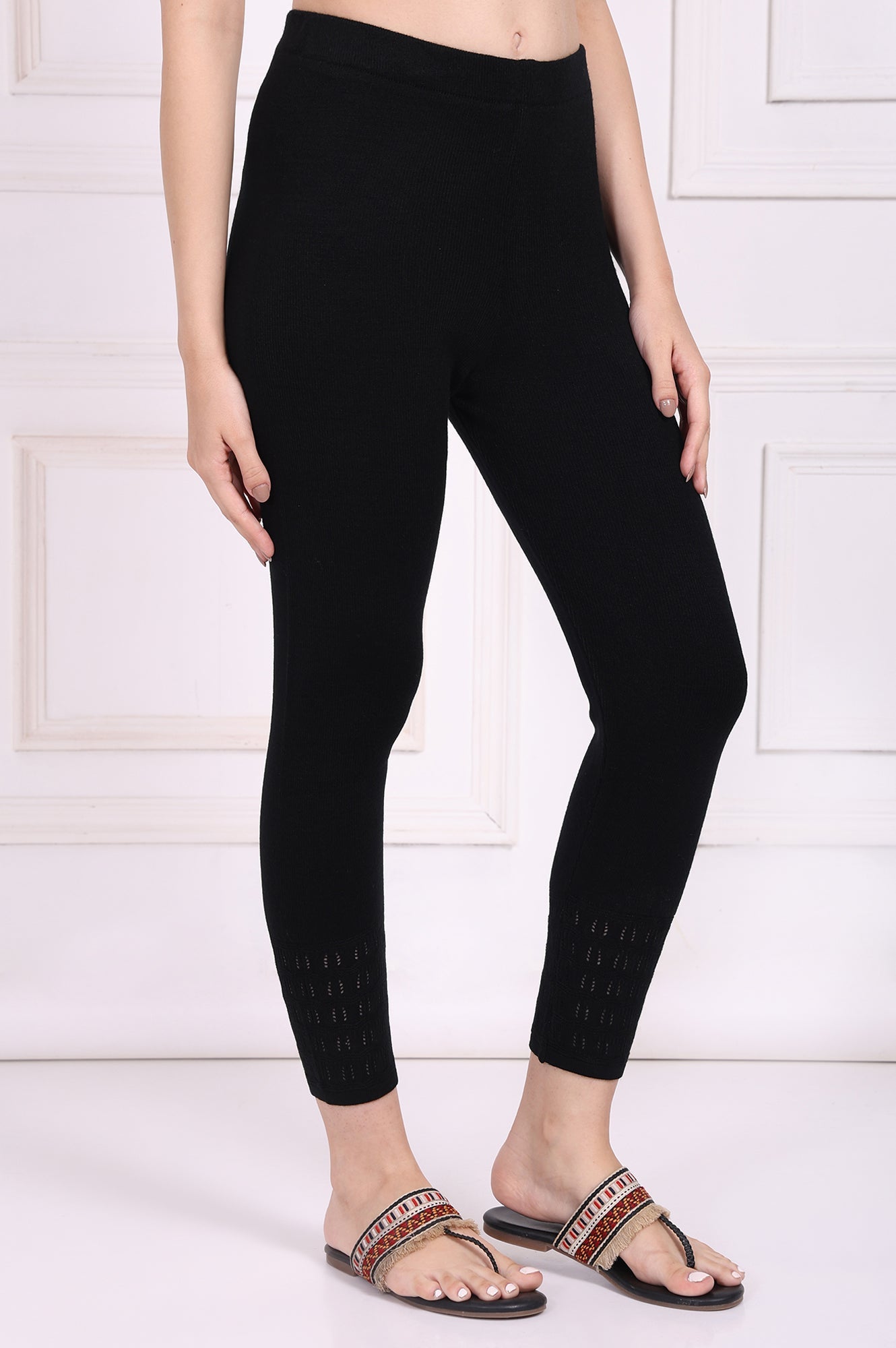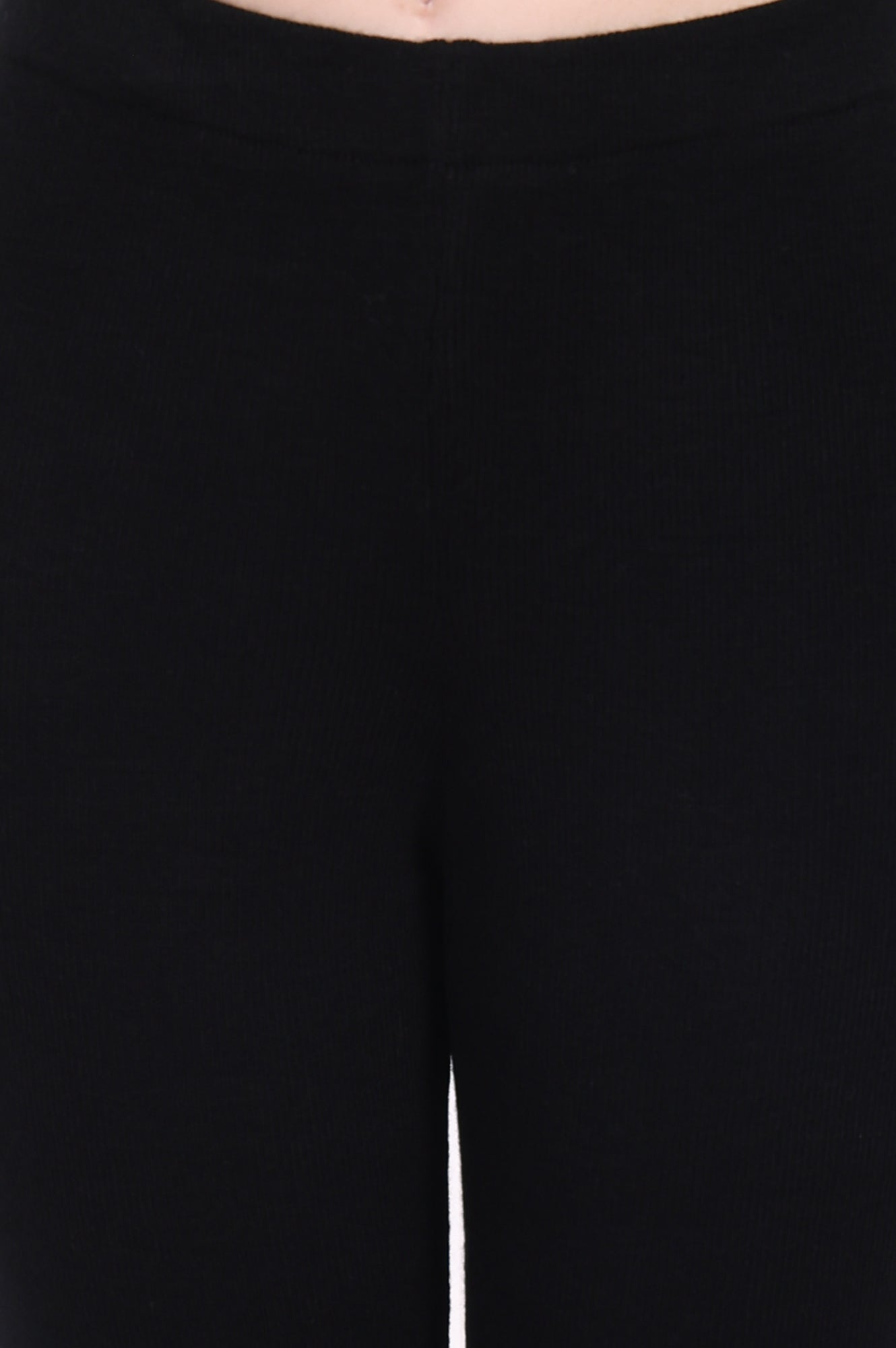 Soft yet durable, these black acrylic leggings are tailored for winter comfort. The high-rise waistband ensures a snug fit, while the solid design adds versatility to your wardrobe. Perfect for pairing with kurtas or tunics, these leggings offer a sleek silhouette that transitions seamlessly from casual outings to festive occasions. Crafted with a knit technique, they provide warmth without compromising on style. A must-have for layering during colder months.