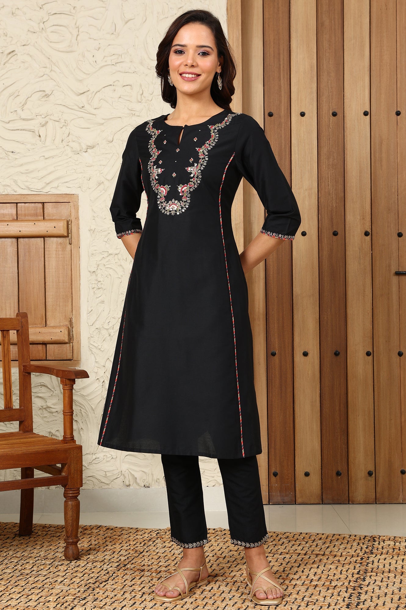 Elevate your festive style with our black solid dori embroidered straight kurta. This classic black kurta exudes sophistication with its sleek, straight-cut silhouette, offering a timeless and versatile look. The kurta features exquisite dori embroidery, meticulously crafted to add a touch of intricate elegance and sparkle to the design. The rich black fabric serves as a perfect canvas for the delicate embroidery, enhancing its festive charm. Ideal for special occasions and celebrations, this kurta combines understated luxury with modern grace, ensuring you stand out with effortless poise and style.